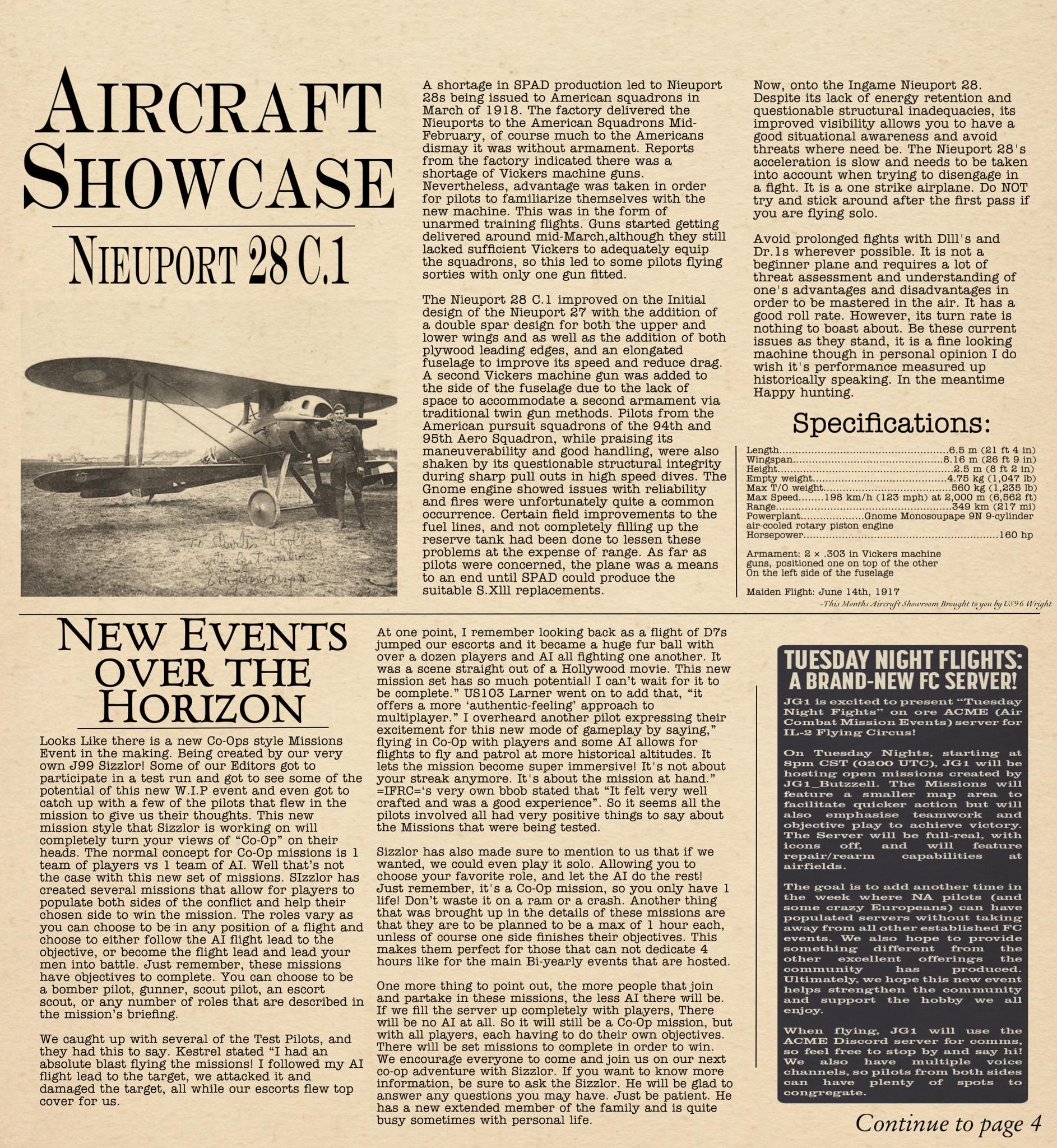US103tRoosevelt Posted February 8 Author Posted February 8 Welcome Back readers to the monthly Newsletter for the IL2 Flying Circus. The official Newsletter for the Flugpark server and representative for the Flying Circus Community! This month, I have a real treat for you all. I got my hands on a really interesting story from the Cross and Cockade magazine regarding the Fokker Eindecker E.III. you can check out that story in the “Aircraft Showcase” Article if you are interested. A huge shoutout to Hawkeye for providing me with a copy of the Cross and Cockade so I could make that Article! I hope you all enjoy the read! I changed up my writing style a little for this one, Let me know what you guys think! Without any further ado! The Circus Chronicles presents Issue No. 012! Helpful Links The Circus Chronicles Discord - https://discord.gg/Xc2xqDx5UM Flugpark Server Discord - https://discord.gg/MXHKFW2Ccu Jagdgruppe 2 Discord - https://discord.gg/nYcNv3SsG2 Battle of the Channel Sign up - https://discord.gg/6VqBaRCgYc 2