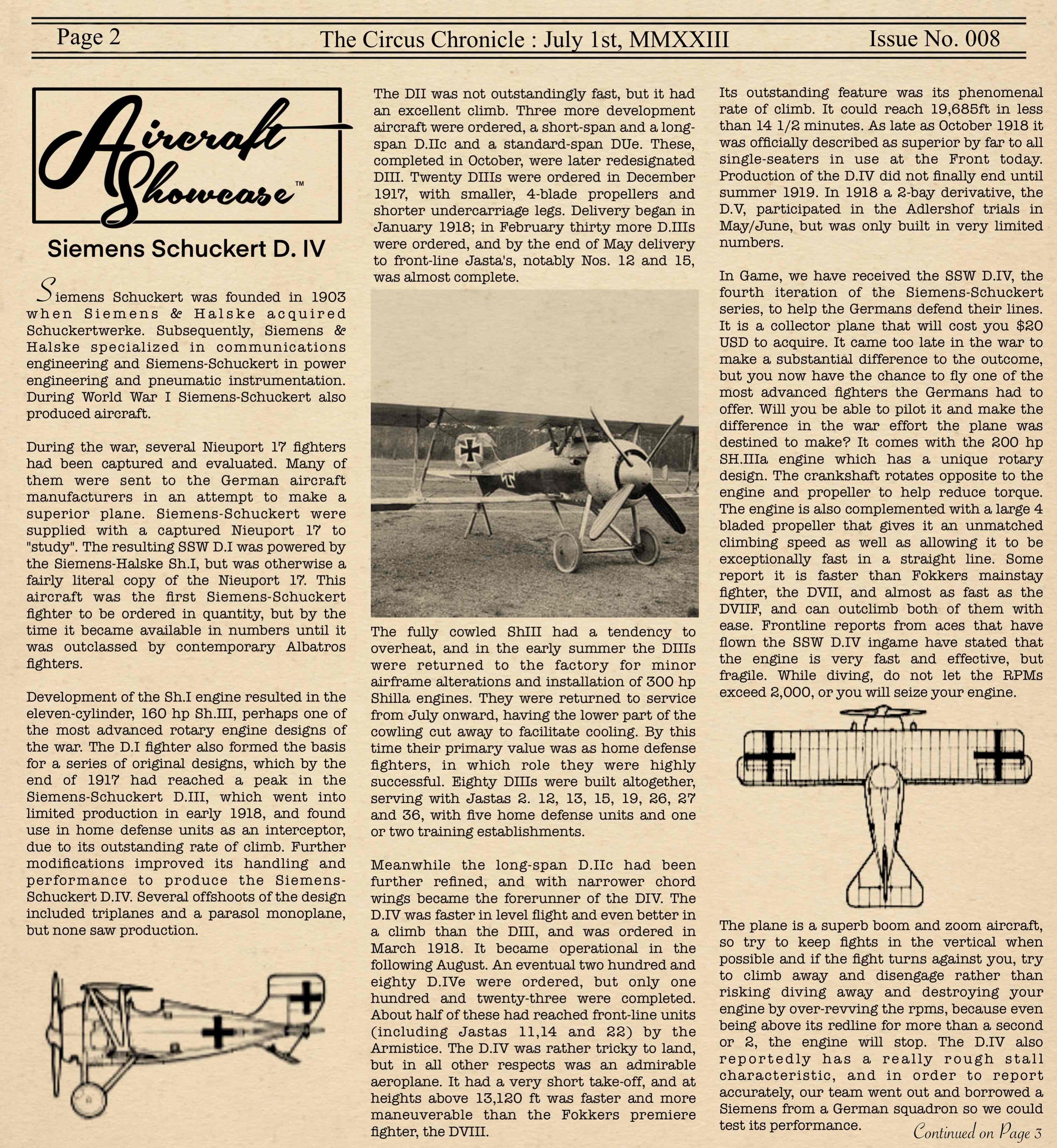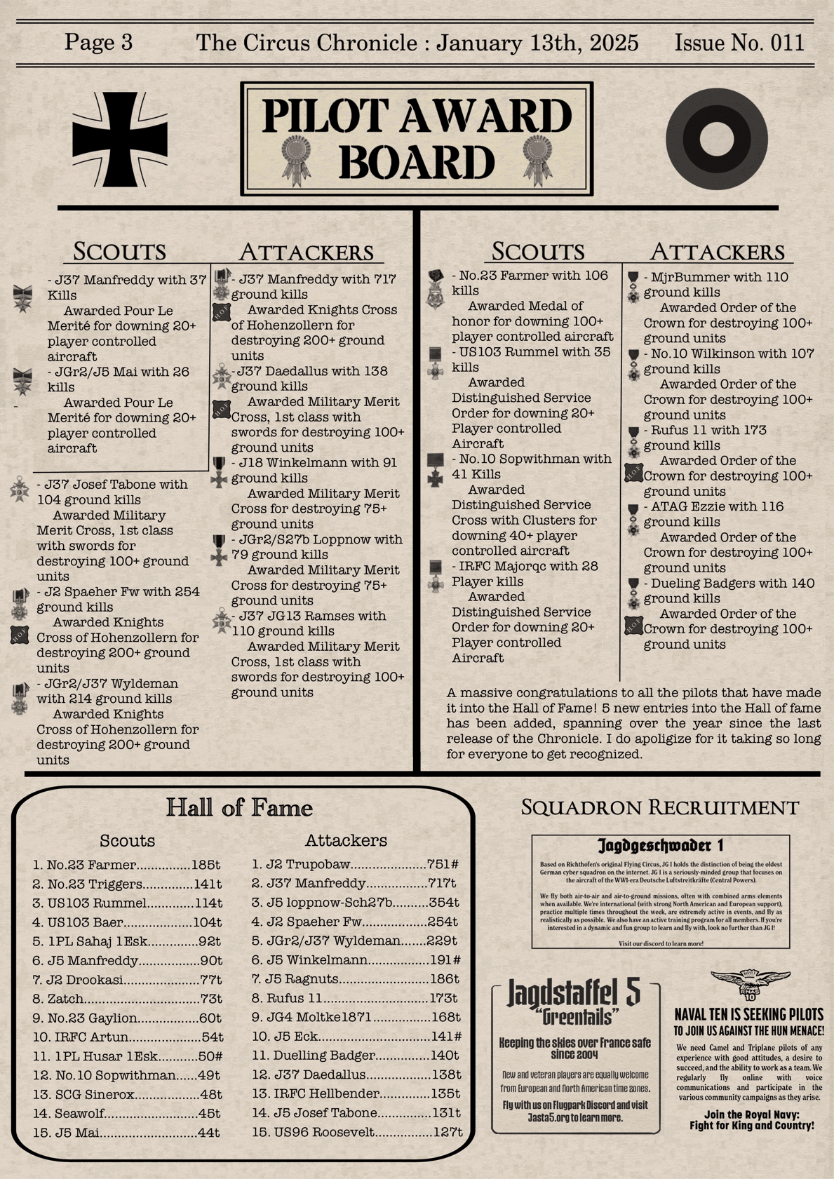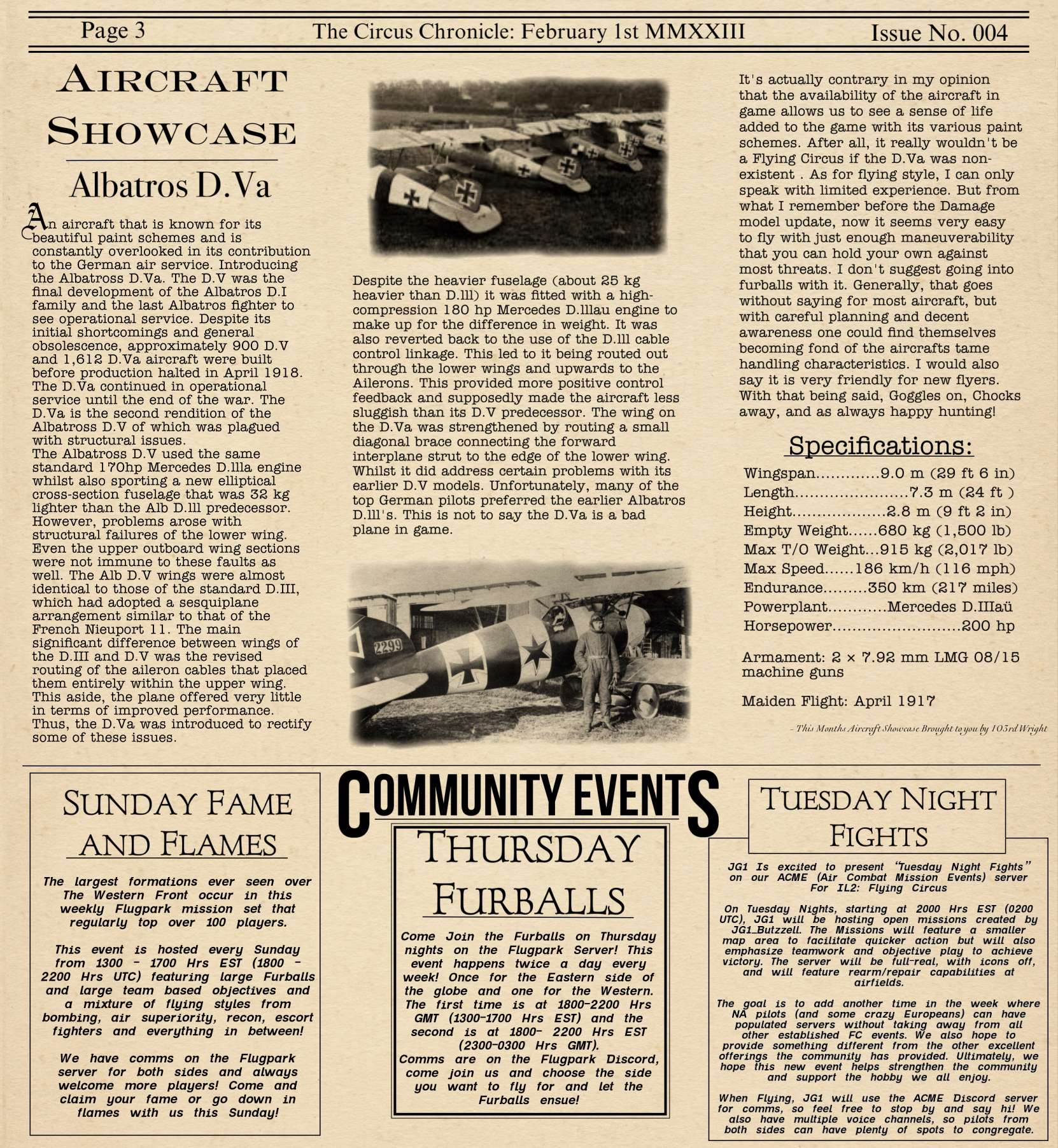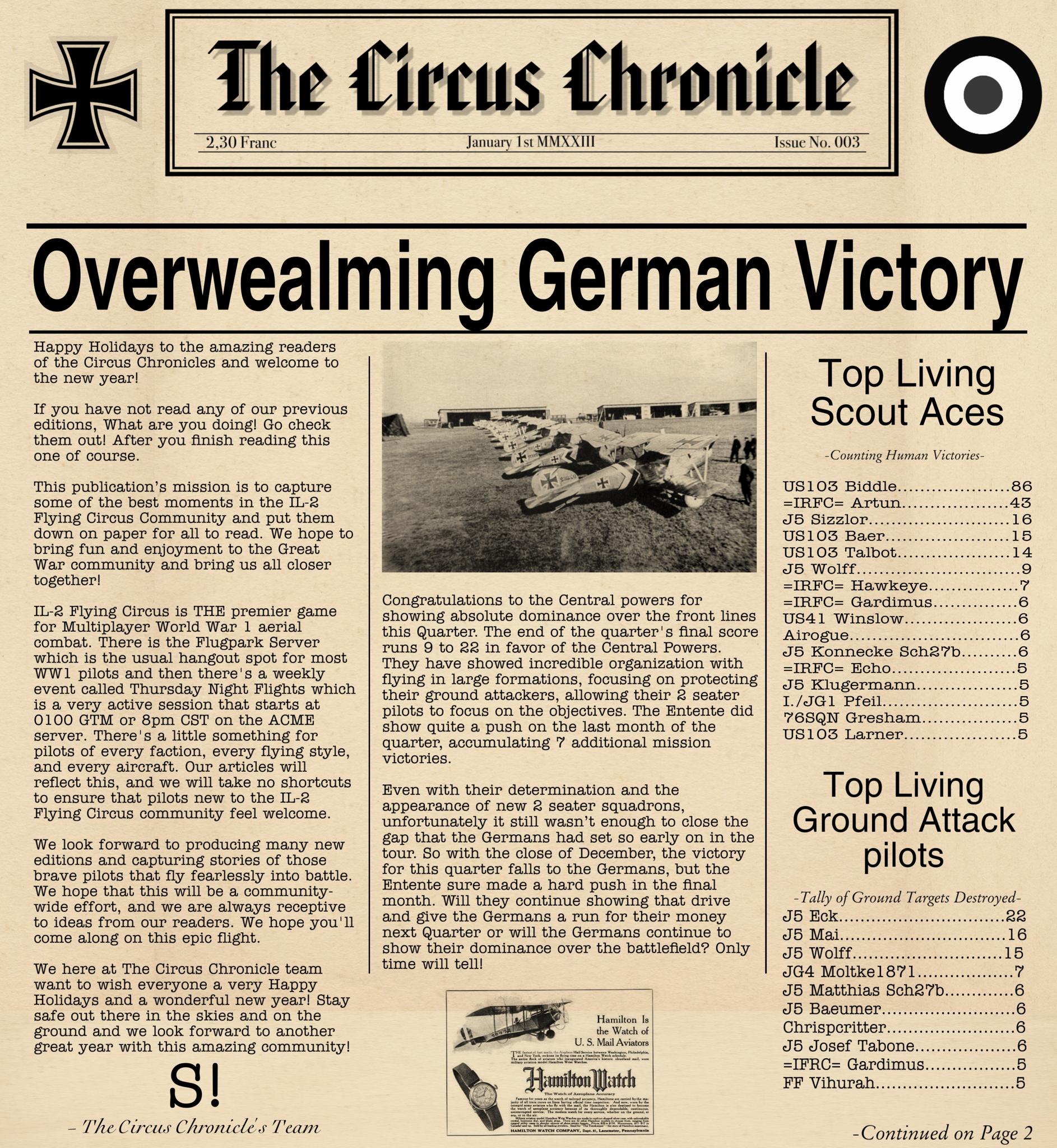 US103tRoosevelt Posted January 6, 2023 Author Posted January 6, 2023 (edited) Welcome back everyone to the Circus Chronicle! We hope you all had a good Holidays and we welcome you all to 2023! Cheers to a new and hopefully year! We would like to apologize to our readers for being late this edition. The team has ran into many personal things that has prevented us from working at full capacity. I'm sure we have made everyone wait long enough, so here we go! Fresh off the press. The Circus Chronicle Issue No. 003! We hope you all enjoy the read! -----Helpful Links----- Squadron Recruitments No.10 (Naval) Squadron R.N.A.S Discord-- https://discord.gg/Hxq6weRCzB Jasta 5 Discord-- https://discord.gg/nYcNv3SsG2 Website-- Jasta5.org JG-1 Discord-- https://discord.gg/SM6Uk5XuJ2 US96th Aero Bombardment Squadron Discord- https://discord.gg/8nychhpD Useful Links The Circus Chronile Discord-- https://discord.gg/ac39xuJQ Gorrell’s History 282pg Doc. https://www.fold3.com/publication/80/gorrells-history-aef-air-service/browse Gorrell's History 18 pg Pamphlet —> https://www.fold3.com/pdf/M990.pdf Link for Tactical Advice Credit-- https://encyclopedia.1914-1918-online.net/article/reconnaissance_and_observation Tuesday Night Fights Discord-- https://discord.com/invite/QcQ2AcwZhz Stats Page-- http://stats.jg1.org:8000/en/ Pilots Honor Roll awards https://forum.il2sturmovik.com/topic/54929-pour-le-merite-blue-max-and-distinguished-service-orders-and-higher-awards/ www.flugpark.org -----Team Member Shout Outs----- -Aircraft Showroom Article- US103_Wright -History Channel Article- Us103_Talbot -Editors- tKestrel, US103_Talbot, US103_Wright Once Again, We would like to apologize to the readers for the very late delivery! We will work harder next time to make sure we are on time next time! Thank you all for your patience waiting for us to release this months release. We hope you all had a great start to your year and we look forward to seeing you all again next month for Februarys edition! -S The Circus Chronicle's Team Edited January 7, 2023 by US96_tRoosevelt 7