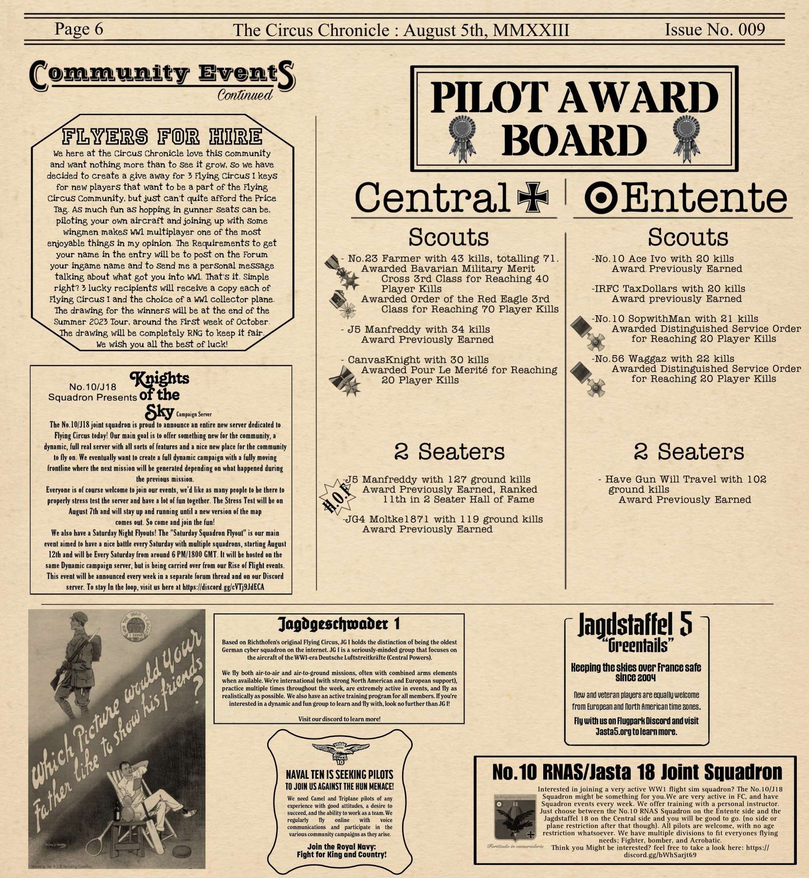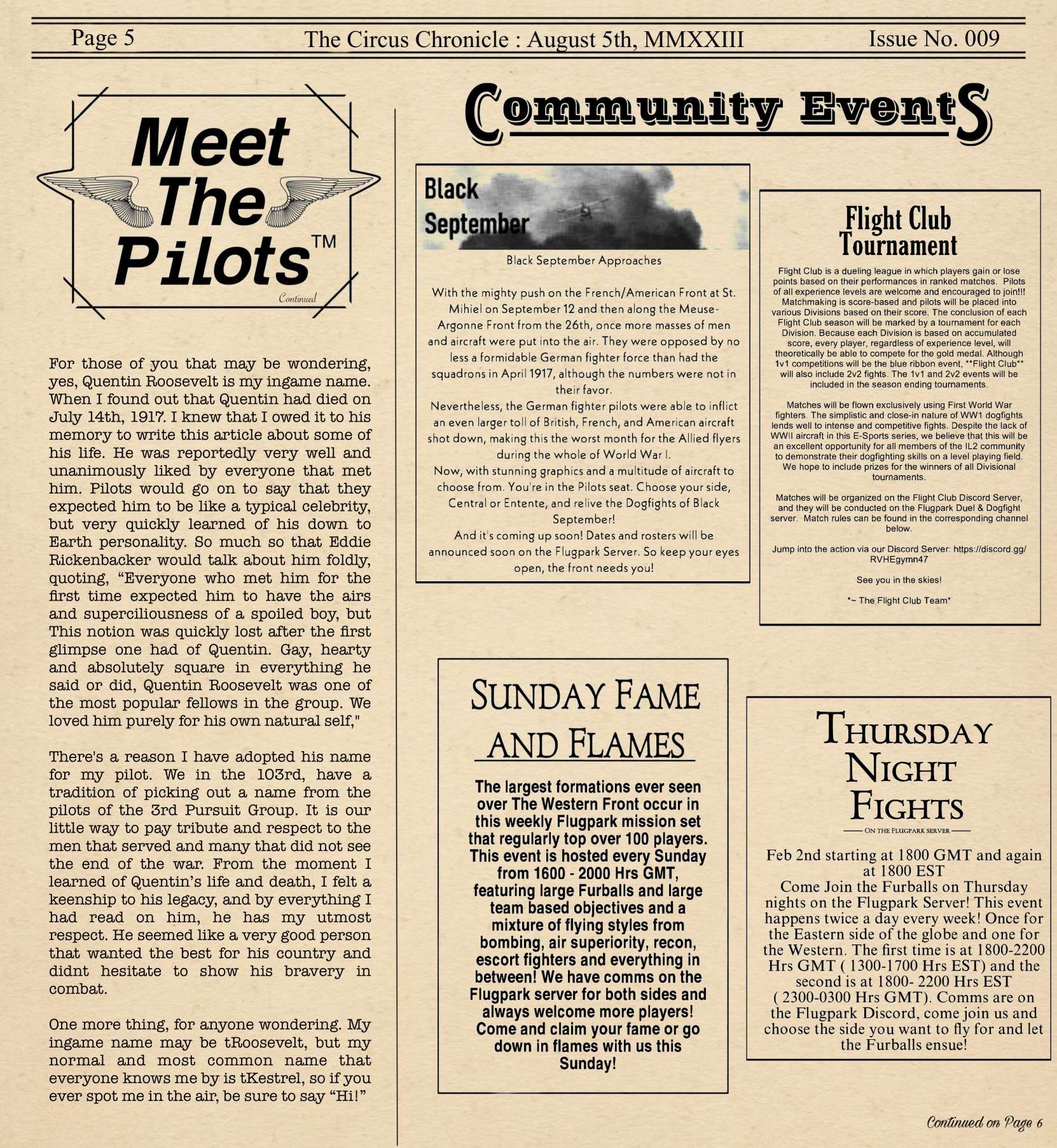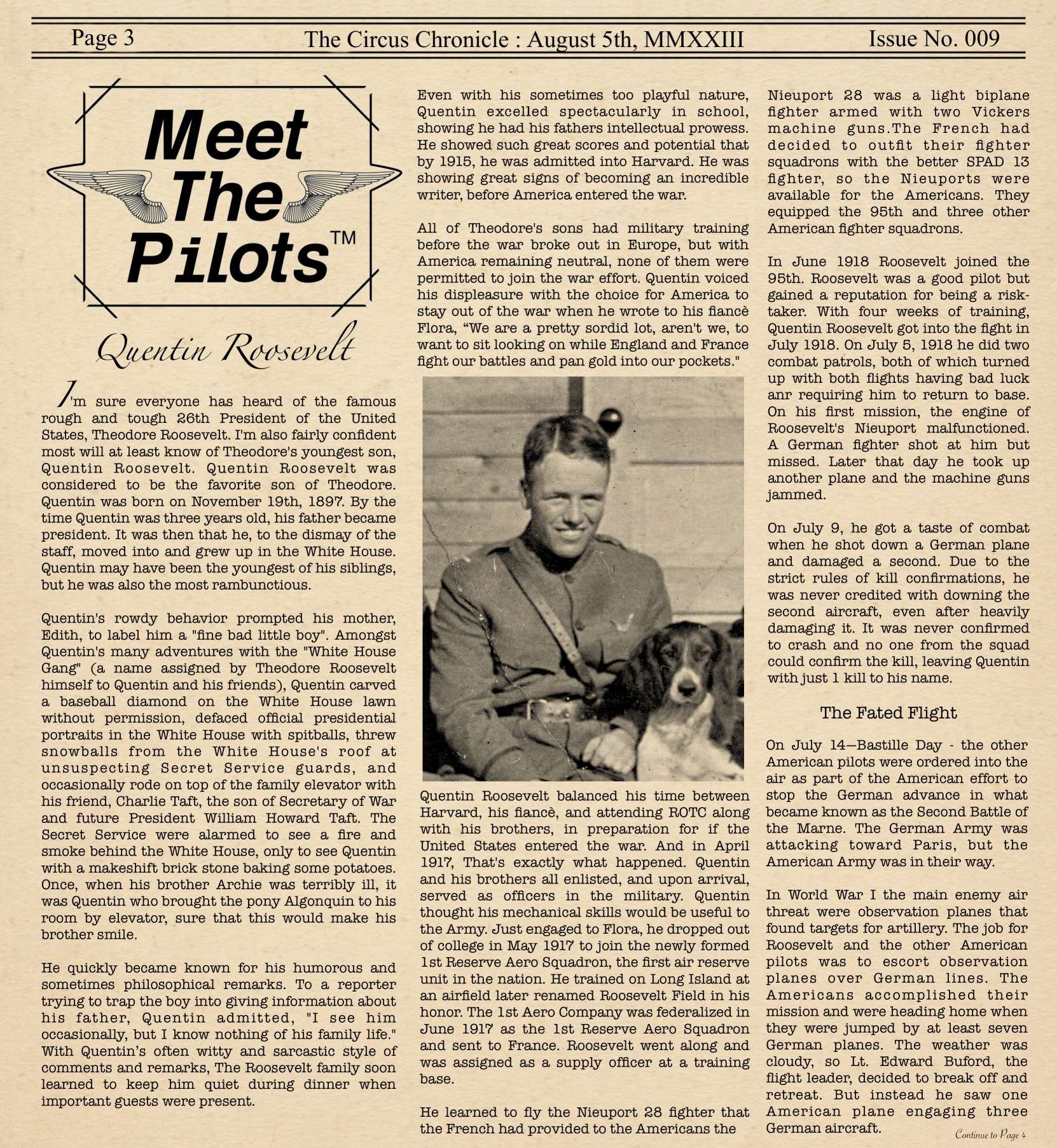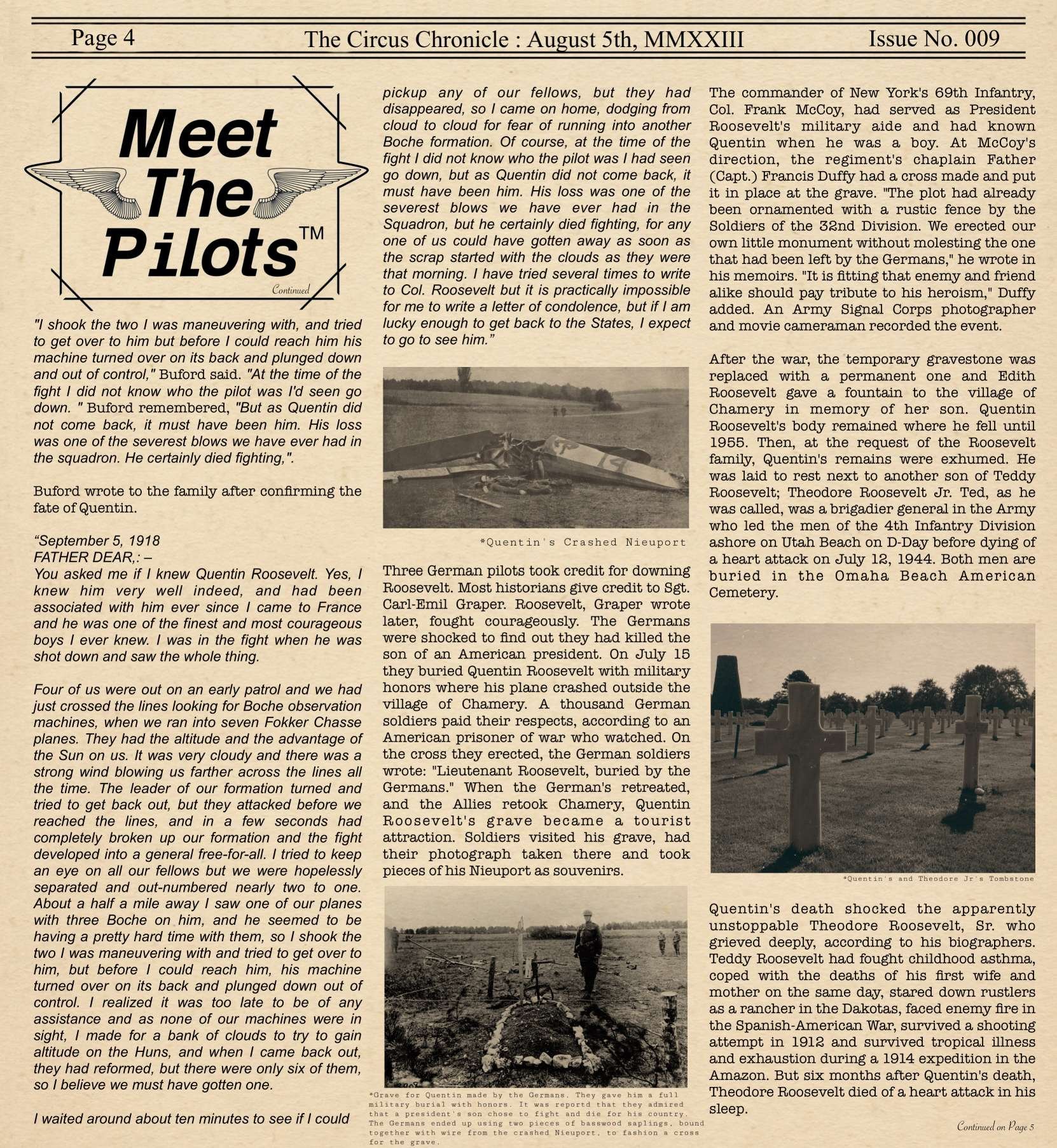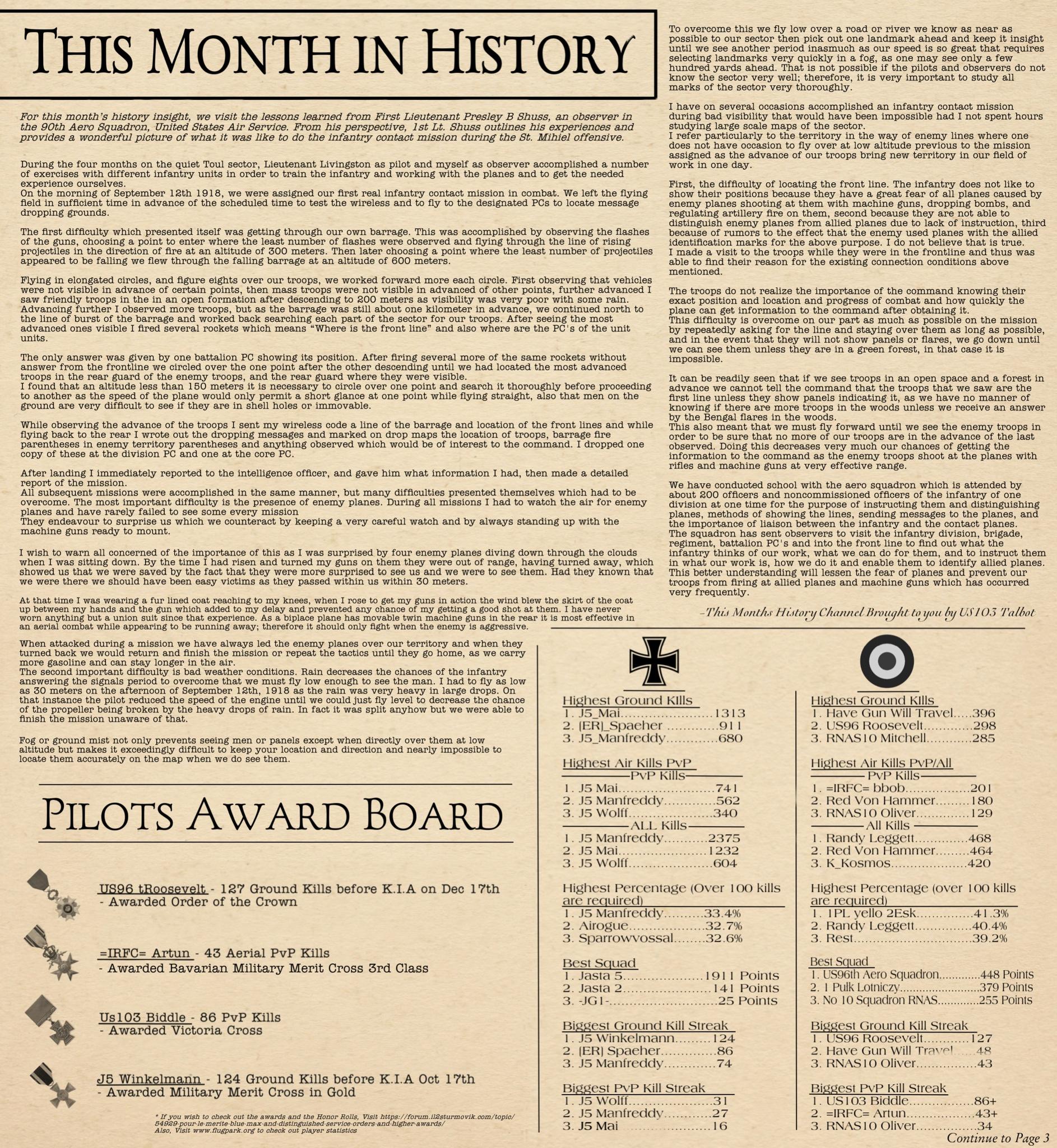 US103tRoosevelt Posted August 5, 2023 Author Posted August 5, 2023 Hey Readers and welcome back to the Circus Chronicle! Right on time this month as well! Nice to finally be back in the groove. This Months edition will be a little longer than usual. I chose to make a new article and one of my historic articles ended up taking a lot more pages. Than I thought. But fear not. If you come here in short time, I will leave a Table of Context to help you more time pressed readers to get to what matters most for you. I have also reworked the entire article name style, to help give each article its own unique title block. Let me know what you guys think. Another thing that has been added to the Paper is a little ad in the Community Events called Flyers for Hire. If you are new to the WW1 community and have been stuck being a gunner because you do not own a copy of Flying Circus, This is the Ad for you. Be sure to check it out. It may very well be worth your time. One more quick note for anyone that did not see my discord message stating the time that I would stop recording stats. So if your stats do not display the current stats that you may have, that is because I froze the stats for the paper on July 31st to help me with being able to focus on organizing the paper instead of constantly having to change stats last minute. This will be a continued trend from here on out with locking the stats on the 31st. I will give you guys a 24 hour notice on the discord if you are curious of the lock time. And now without and Further Ado The Circus Chronicle Issue No. 009 Fresh Off the Press! Page 1 HeadLines - Server Based Article This Month in History - Article with dates from WW1 Top Living Scouts and 2 Seater Scoreboard Page 2 This Month in History Continued FrontLine Affairs - Article for Pilots of the Front Hall of Fame Page 3 Meet The Pilots - Quentin Roosevelt Page 4 Meet the Pilots Continued Page 5 Meet the Pilots Continued Community Events Page 6 Community Events Continued Pilot Award Board Squadron Recruitment -----Helpful Links----- Squadron Recruitments - No.10 (Naval) Squadron R.N.A.S Discord- https://discord.gg/Hxq6weRCzB - Jasta 5 - Discord--https://discord.gg/nYcNv3SsG2 - Website-- Jasta5.org - JG-1 - Discord-https://discord.gg/SM6Uk5XuJ2 - No.10RNAS/Jata 18 Joint Squadron -Discord- https://discord.gg/bWhSarjt69 Useful Links The Circus Chronile Discord-- https://discord.gg/UaqRxHANnN Tuesday Night Fights -Discord-https://discord.com/invite/QcQ2AcwZhz -Stats Page--http://stats.jg1.org:8000/en/ Flight Club Tournament - https://discord.gg/jbaAdvqXq Pilots Honor Roll awards https://forum.il2sturmovik.com/topic/54929-pour-le-merite-blue-max-and-distinguished-service-orders-and-higher-awards/ - Website - www.flugpark.org Black September Book for the Black September event coming up - Black September, 1918 *Please be sure to let me know if any of these discord links do not work. I will update them ASAP if they are invalid. 3 1