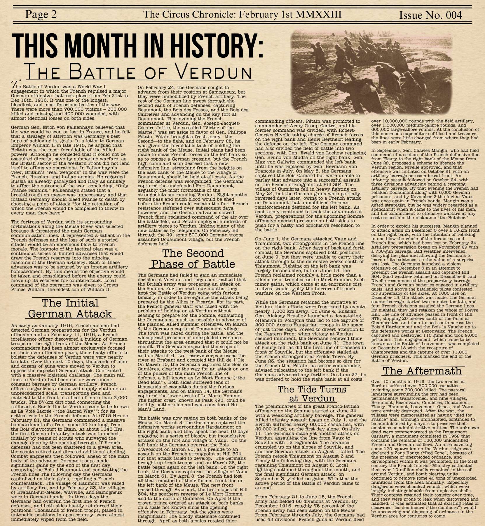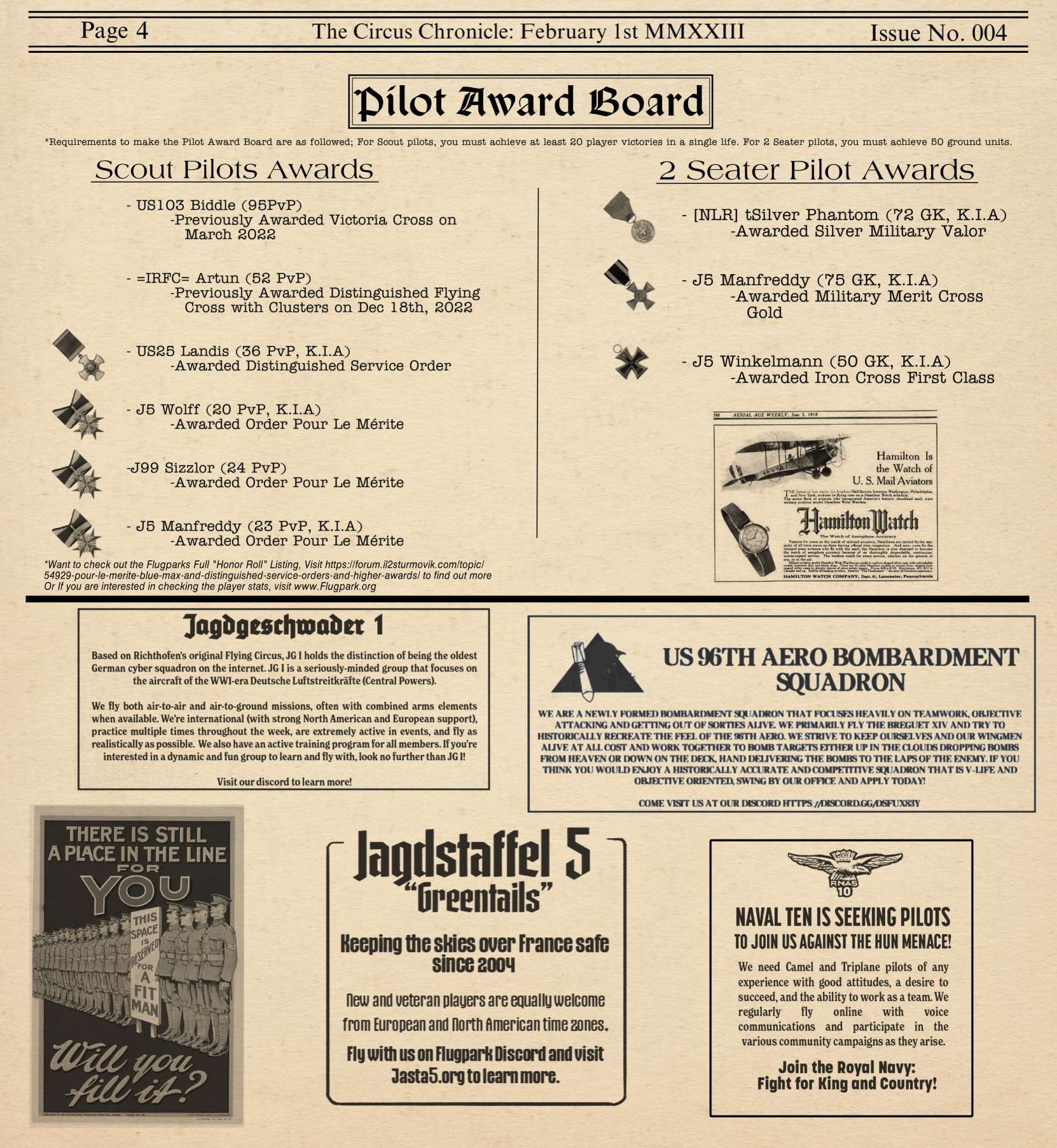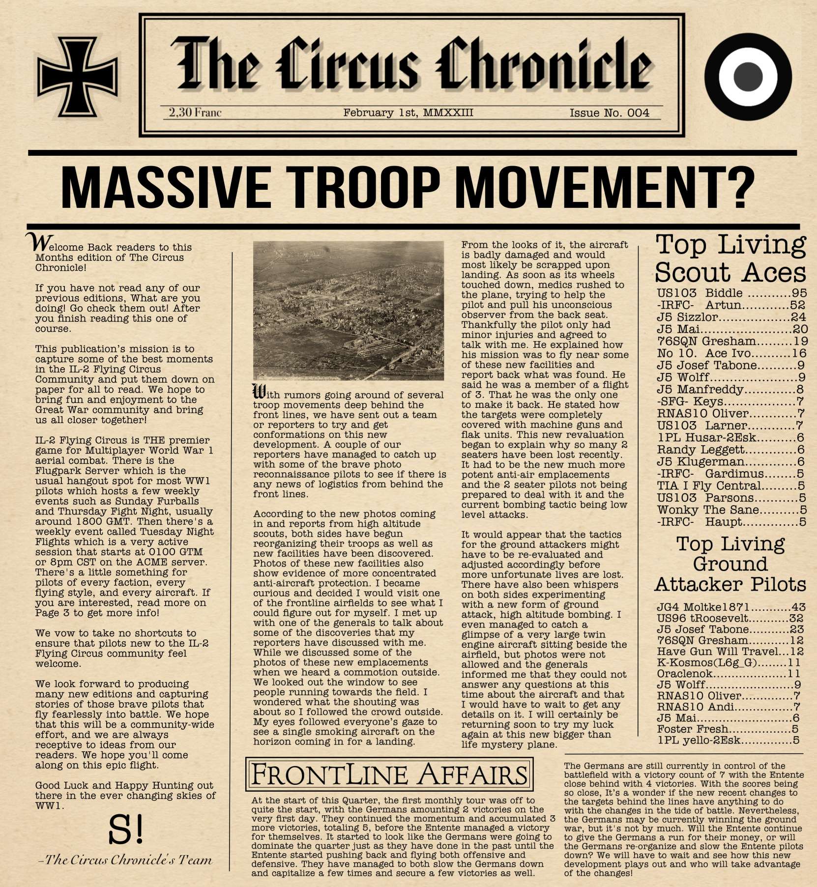 US103tRoosevelt Posted February 9, 2023 Author Posted February 9, 2023 (edited) Welcome Back to the Circus Chronicle! The "Monthly" Flying Circus Newletter where we give you updates on the frontline of the most popular Flying Circus server, the Flugpark, as well as give you some stories from real historic stories and upcoming community events. Before you gents read, I just have to appologize once more for the issue being late. I am working through a hiring process thats almost 2 hours from my home and working on moving closer to the new potential job. So for almost 3 weeks I have been very busy. Thank you everyone for your patience. I will work extra hard to make sure the March edition is out on time! But without further Ado! Heres issue No. 004! Fresh off the press! -----Helpful Links----- Squadron Recruitments - No.10 (Naval) Squadron R.N.A.S Discord- https://discord.gg/Hxq6weRCzB - Jasta 5 - Discord--https://discord.gg/nYcNv3SsG2 - Website-- Jasta5.org - JG-1 - Discord--https://discord.gg/SM6Uk5XuJ2 -US96th Aero Bombardment Squadron -Discord https://discord.gg/MKNcUMUA Useful Links The Circus Chronile Discord-- https://discord.gg/ac39xuJQ Tuesday Night Fights -Discord-https://discord.com/invite/QcQ2AcwZhz -Stats Page--http://stats.jg1.org:8000/en/ Pilots Honor Roll awards https://forum.il2sturmovik.com/topic/54929-pour-le-merite-blue-max-and-distinguished-service-orders-and-higher-awards/ - Website - www.flugpark.org Edited February 9, 2023 by US96_tRoosevelt Im an idiot x3 6 3 1