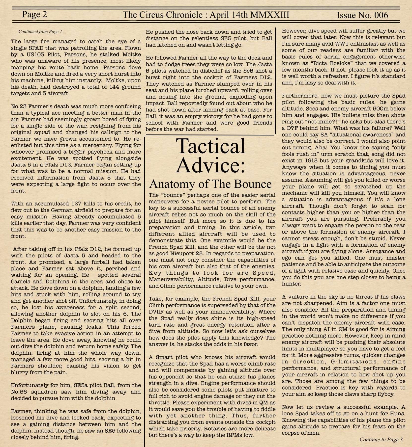 US103tRoosevelt Posted April 19, 2023 Author Posted April 19, 2023 Welcome back to the “Monthly” newsletter for Flying Circus where we give you, our very patient readers, updates on the game development, server information and community held events spanning from servers like FlugPark and ACME. This issue is yet again much later than I would have liked, but the move is complete, and I'm settling in to the new job. Just doing a month of training with homework which is a big reason this paper is so late. Things should be back on track very soon, and once things are back to a smooth orderly schedule release pattern, I have come interesting projects for the paper and for you, our valued reader, and for the newer members of Flying Circus. Now seeing as this release is a little larger than our previous releases, I will be including a small Table of Context for those of you that are in a hurry or dont feel like reading the whole paper, which is understandable and doesnt hurt my feelings if you dont want to read the whole thing lol. Page 1 -Intro -Frontline Affairs -Top Living Pilots Page 2 -Front Line Affairs Cont. -Tactical Advice Page 3 - Tactical Advice Cont. - History Channel Page 4 -History Channel Cont. Page 5 -History Channel Cont. -Upcoming Community Events Page 6 - Pilot Award Board -MVPs of the Tour -Squadron Recruitment Without any further Ado, The Circus Chronicle Issue No. 006, Fresh Off The Press! -----Helpful Links----- Squadron Recruitments - No.10 (Naval) Squadron R.N.A.S Discord- https://discord.gg/Hxq6weRCzB - Jasta 5 - Discord--https://discord.gg/nYcNv3SsG2 - Website-- Jasta5.org - JG-1 - Discord--https://discord.gg/SM6Uk5XuJ2 -US96th Aero Bombardment Squadron -Discord https://discord.gg/MKNcUMUA Useful Links The Circus Chronile Discord-- https://discord.gg/ac39xuJQ Tuesday Night Fights -Discord-https://discord.com/invite/QcQ2AcwZhz -Stats Page--http://stats.jg1.org:8000/en/ Pilots Honor Roll awards https://forum.il2sturmovik.com/topic/54929-pour-le-merite-blue-max-and-distinguished-service-orders-and-higher-awards/ - Website - www.flugpark.org 7