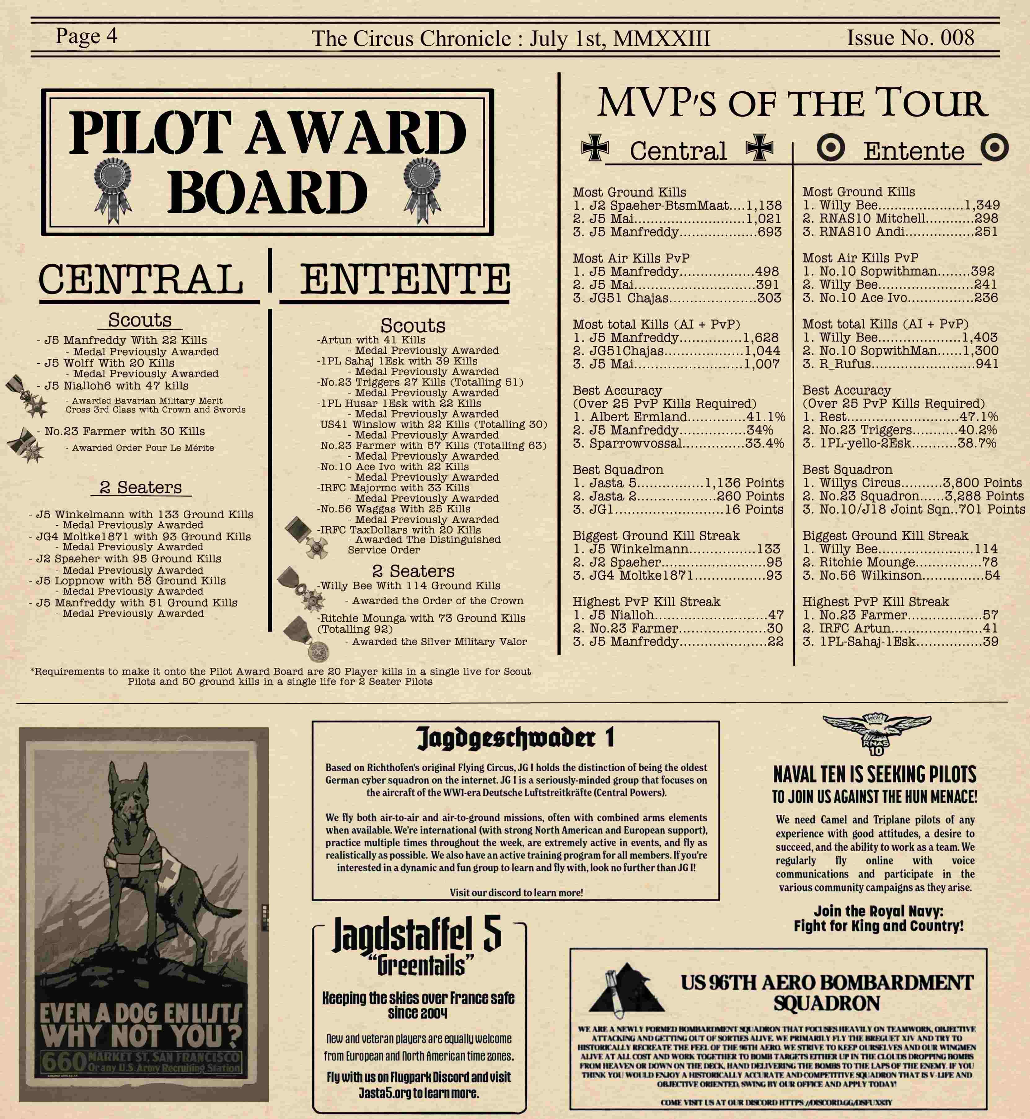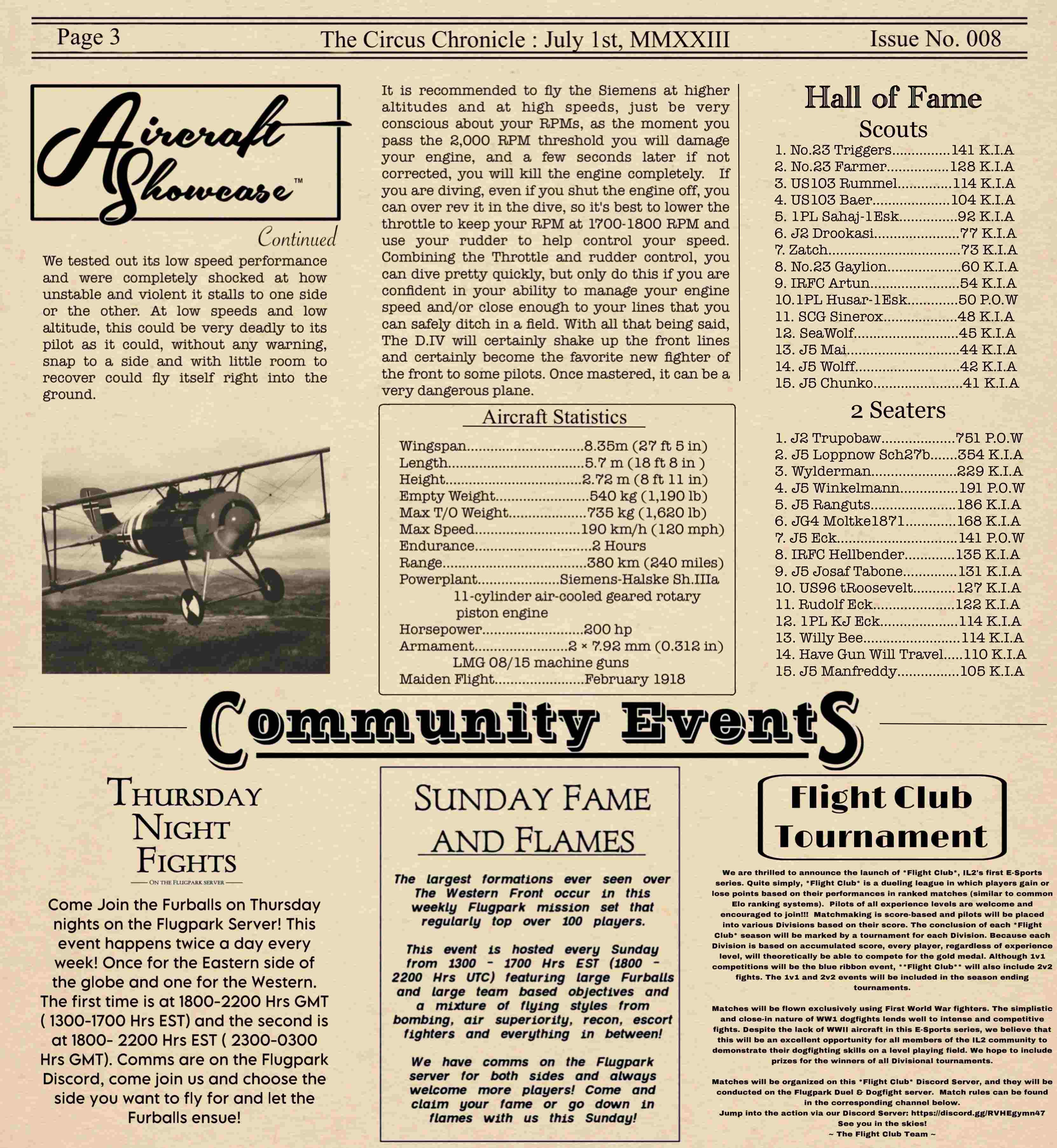 US103tRoosevelt Posted July 9, 2023 Author Posted July 9, 2023 Hey Readers and welcome back to the Circus Chronicle! We are back from out month and a half off and have gotten most everything in the office sorted out so it should be smooth flying from here on out. Thank you all for being so patient and allowing me to take the time off to get everything in my personal life as well as organizing the circus chronicle as well. Hopefully there will be a little better quality as I continue to improve the layout, looks, and style of the paper. We were scheduled to have this paper out and ready by the first but the website www.flugpark.org glitched and didnt roll over, making me think that I have miscounted the months and was wrong about the end of the tour and ended up rewriting over half of the paper. Only to find out, it was just the website bugging out and had to be manually rolled over, meaning I had to re-rewrite the same half of the paper again. This is the only reason the paper was later than anticipated this time. I am glad to finally have everything back on track and ready for you guys to read! And without further ado. The Circus Chronicle Issue No. 008! Fresh off the Press -----Helpful Links----- Squadron Recruitments - No.10 (Naval) Squadron R.N.A.S Discord- https://discord.gg/Hxq6weRCzB - Jasta 5 - Discord--https://discord.gg/nYcNv3SsG2 - Website-- Jasta5.org - JG-1 - Discord--https://discord.gg/SM6Uk5XuJ2 -US96th Aero Bombardment Squadron -Discord https://discord.gg/wJ4VnX8kVQ Useful Links The Circus Chronile Discord-- https://discord.gg/UaqRxHANnN Tuesday Night Fights -Discord-https://discord.com/invite/QcQ2AcwZhz -Stats Page--http://stats.jg1.org:8000/en/ Flight Club Tournament - https://discord.gg/jbaAdvqXq Pilots Honor Roll awards https://forum.il2sturmovik.com/topic/54929-pour-le-merite-blue-max-and-distinguished-service-orders-and-higher-awards/ - Website - www.flugpark.org *Please be sure to let me know if any of these discord links do not work. I will update them ASAP if they are invalid. 3 2