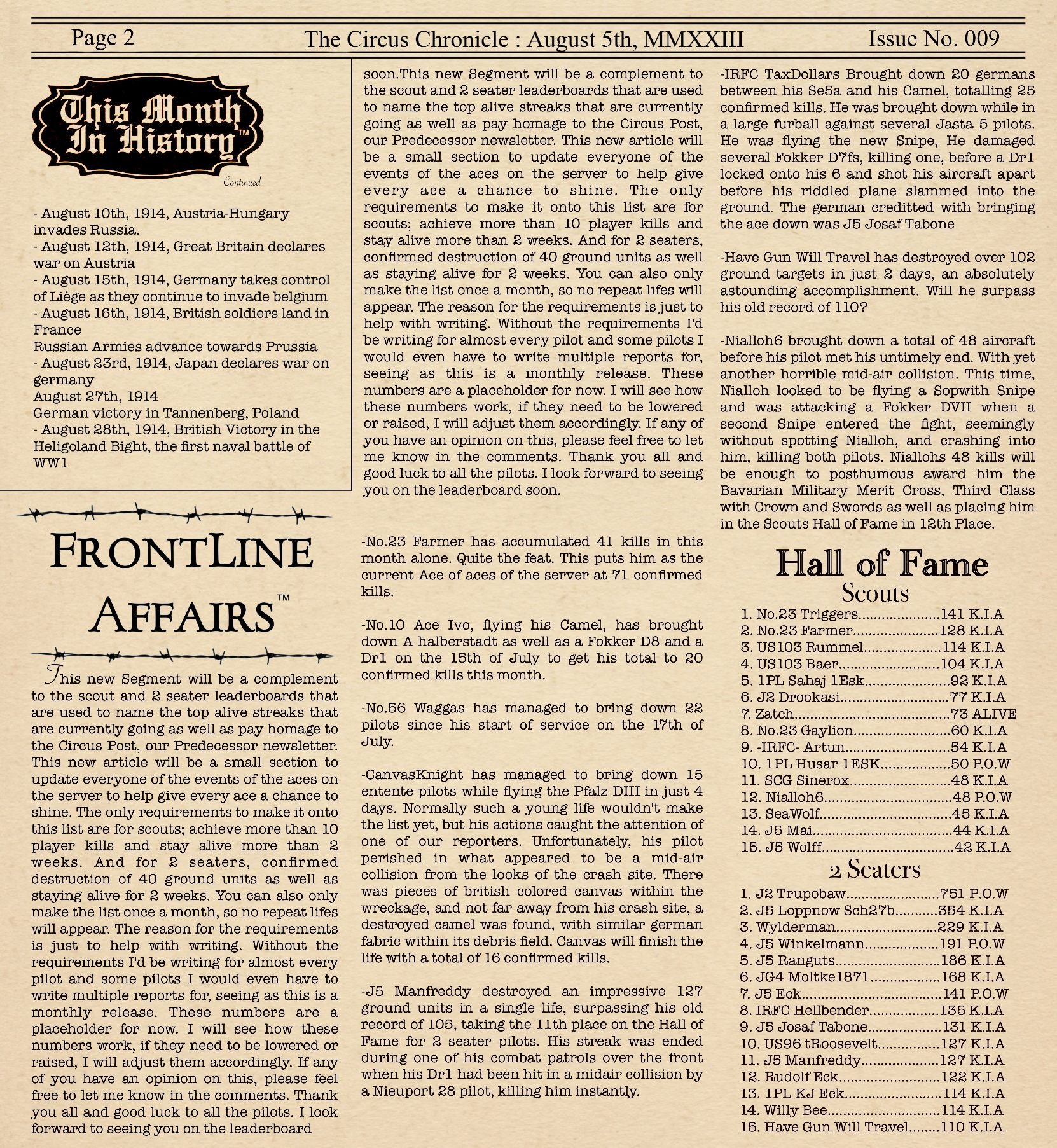 US103tRoosevelt Posted September 6, 2023 Author Posted September 6, 2023 (edited) Welcome back readers to the premier monthly newsletter for IL2 Flying Circus, The Circus Chronicle! Before I get too deep in this months release, I do want to apologize to the readers of last issue. I missed a death in regard to No.23 Farmer and that caused quite a bit of the last issue to be incorrect. I would have fixed it but it would have taken me over a complete day to redo the paper. I wish it was as easy as select and delete, but I would have basically had to remake the whole paper to get that info correct. I just did not have time to fix it, so if anything looks different with this release in regard to farmers stats, that is why. Thank you all for understanding. At the moment, due to life, I am currently the only editor working on the paper right now and currently have no proof reader or stat checker other than myself, hence how some incorrect stats and spelling errors make it into the final print. With that out of the way, I also want to remind everyone that I still have the give away going on for the 3 Keys to your own copy of IL2 Flying Circus I plus your choice of a collector aircraft. This link will take you to the giveaway This Issue is yet again another 6 page release so I will be including an Index for those of you in a hurry or just after specific articles. Page 1 HeadLines - Server Based Article Flyers for Hire Giveaway Ad Top Living Scouts and 2 Seater Scoreboard Page 2 Hall of Fame Frontline Affairs - Article for the Pilots of the Front Page 3 Aircraft Showcase Page 4 Aircraft Showcase cont. Page 5 This Month in History Community Events Page 6 Pilot Award Board Squadron Recruitment ads -----Helpful Links----- Squadron Recruitments - No.10 (Naval) Squadron R.N.A.S Discord- https://discord.gg/CM3KuAnQYq - Jasta 5 - Discord-- https://discord.gg/MXHKFW2Ccu - Website-- Jasta5.org - JG-1 - Discord- https://discord.gg/ewJE6N4t6D - No.10/Jasta 18 Joint Squadron -Discord- https://discord.gg/cVTj9JdECA Useful Links Flugpark Website http://stats.jasta5.org:8000/en/ The Circus Chronile Discord-- - https://discord.gg/eGkBEpp3d Flight Club Tournament - https://discord.gg/mMuB9yWxV Pilots Honor Roll awards https://forum.il2sturmovik.com/topic/54929-pour-le-merite-blue-max-and-distinguished-service-orders-and-higher-awards/ Black September Book for the Black September event coming up - Black September, 1918 *Please be sure to let me know if any of these discord links do not work. I will update them ASAP if they are invalid. Edited September 6, 2023 by US103_tRoosevelt Forgot something 2