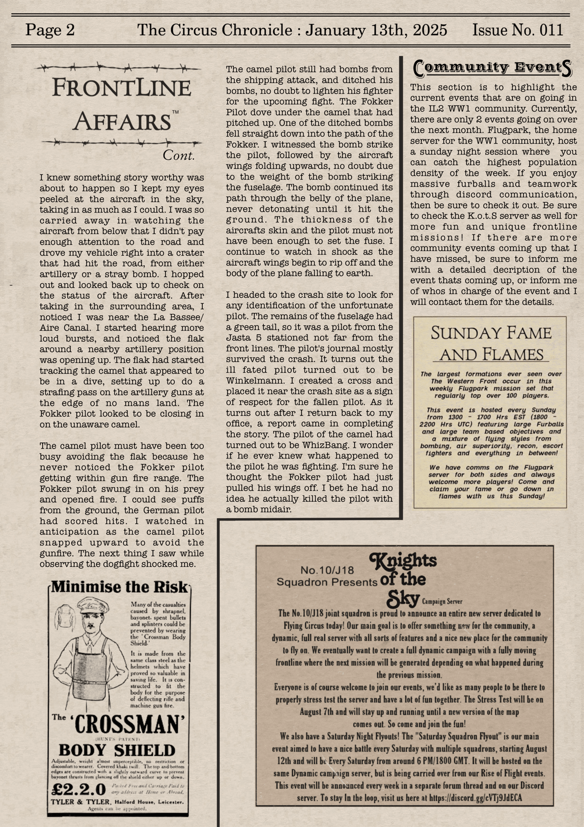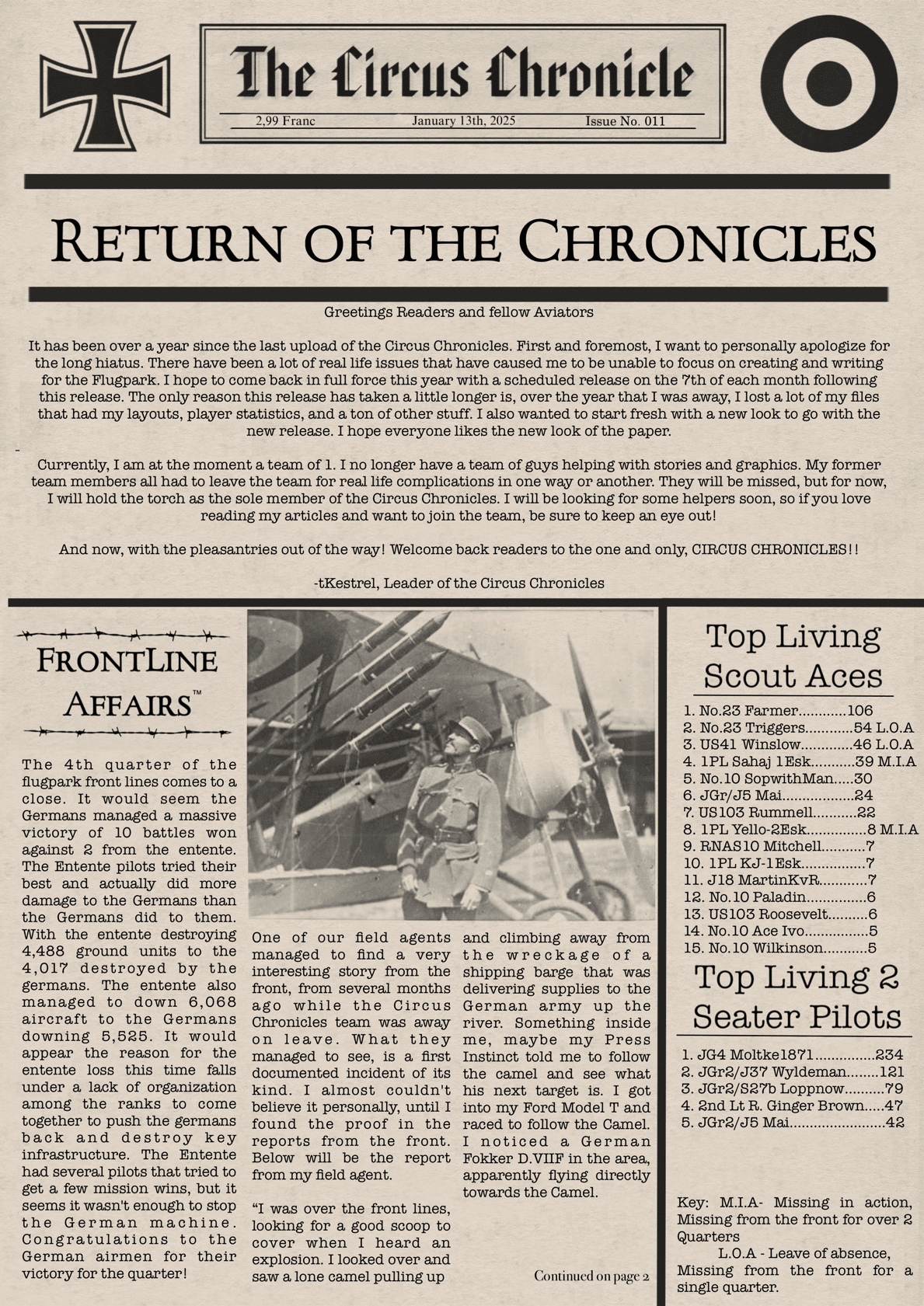 US103tRoosevelt Posted January 13 Author Posted January 13 After a very long hiatus, The Circus Chronicles finally makes a return to the press room! I would like to extend a massive apology to my readers for disappearing without a trace for over a year. I have had a lot of things happen in my life that has had a much higher priority for my attention. One of the biggest changes in my life, ill leave a hint, Im saving up for a ring . So yea I have had a lot going on in my personal life that hasn't allowed me much time to work on the paper. I do plan to be back full time now, with a new release schedule of the 7th of each month. This will be the new release schedule, unless something comes up. If anything changes, I will update everyone through the discord. If you are not a member of the discord, feel free to join! https://discord.gg/eUftnrkRHk The discord also has all of my releases as well as spots to share sorties or screenshots if you wish to contribute to the creation of the paper. The discord also has the HD version of the release. Starting next month, I am also planning to start a search for a new member of the team or 2, so if you are like me and love researching stories from the Great War or just want to be a contributing member of the WW1 IL2 community, be sure to keep an eye out for the Help Wanted Ad that will appear soon . I am the sole member of the Circus Chronicle now, with the rest of the team having to stop for personal life issues as well. All of the former members will be missed! Their help was what helped make the paper what it has become! But enough with the story telling! Im sure you guys are here for the Circus Chronicle! This issue is a little shorter, due to most of my formats and charts being corrupt and I had to start most of my files from scratch. Next month will most likely be back to the longer issues that everyone has came to be used to. Now, without any further ado! The return of the Circus Chronicle! 3