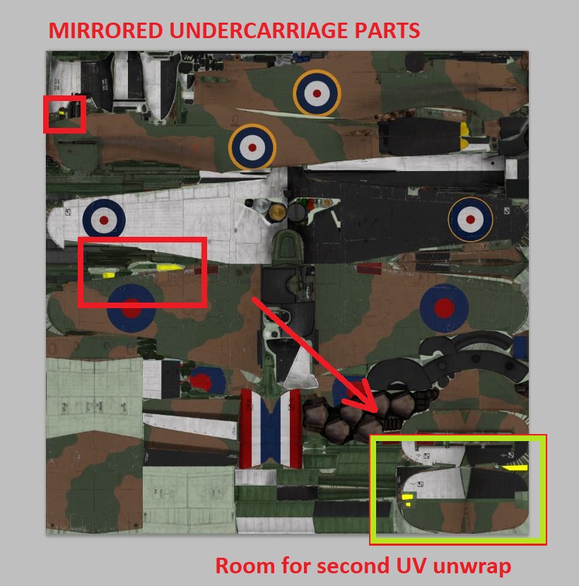 Taurus Posted November 13, 2022 Posted November 13, 2022 G'day, I've struck a problem with mirrored textures while doing Battle of France skins for the Hurricane. By mirrored I mean that one part of the main texture is used on two parts of the Hurricane model (It is actually used on three parts of the model in this case. There is also another part duplicated but that is another story.) The RAF used a black and white identification marking underneath the aircraft which unfortunately highlights the problem. The one undercarriage part in a single location (Yellow) of the main texture which is duplicated onto the model in two places causing the problem. There is however space on the main texture to have two separate instances of the part? To fix it would mean revisiting the model UV unwrap and posting an update. (Unlike the BF109 problem which has propergated throughout all the models and would be a much bigger task.) I am hoping that this problem will be fixed and that mirroring is kept to necessary parts. Cheers, 1