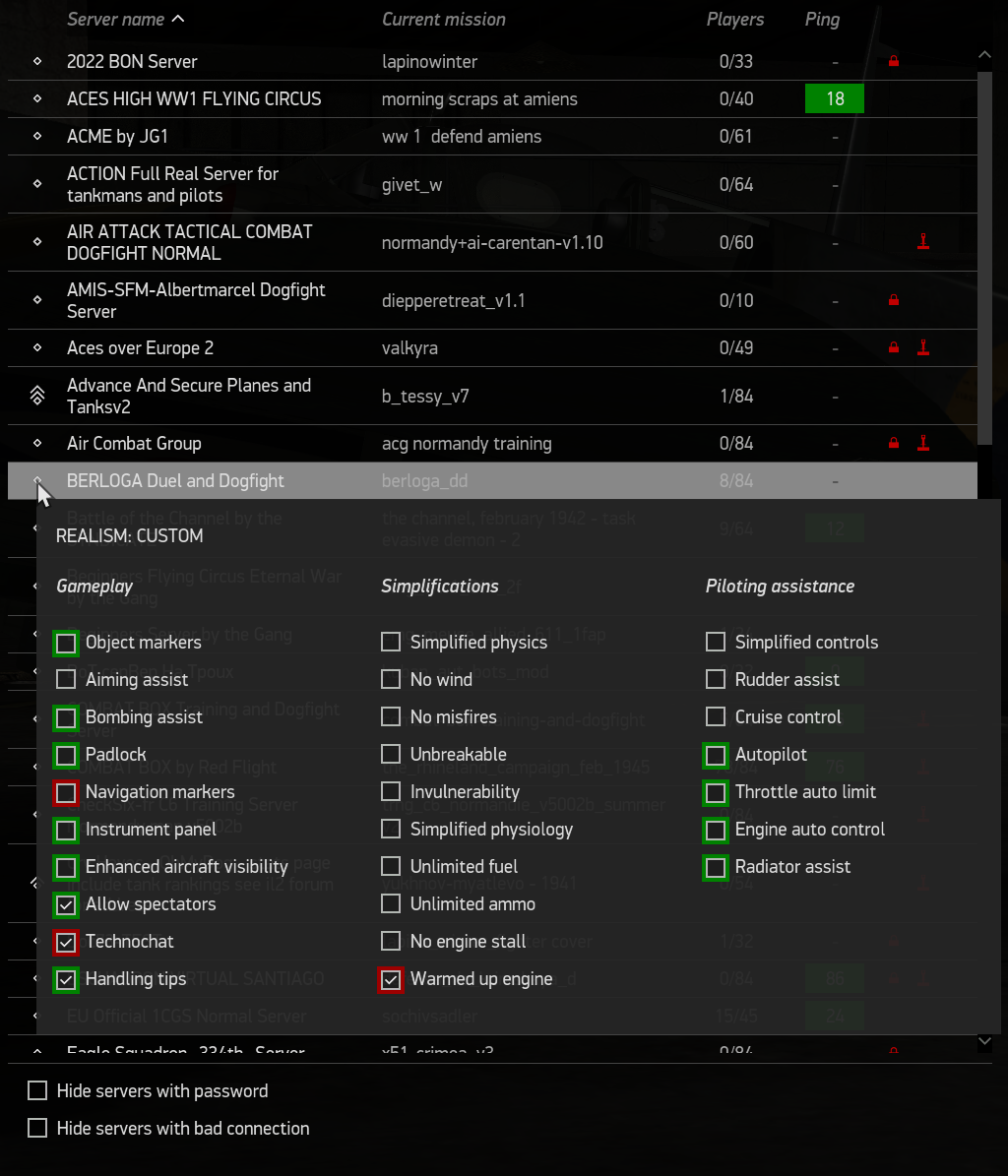 Red box checked means enabled, so pre-warmed engine enabled (try starting a pe2 on a winter map) most servers have this enabled. All other disabled. I think the coloured boxe are coded to the settings they come under so how they group. So green and red boxes colour have no significance wrt tick boxes. If its ticked it is enabled, so spectators (ie bail and watch from chute), technochat (flaps,throttle, mixture prop pitch % displayed if you have them enabled in your game settings) can be shown, and handling hints (the garbage that comes up telling you are flying too fast or too slow or too low is also displayed if your game setting have it enabled.