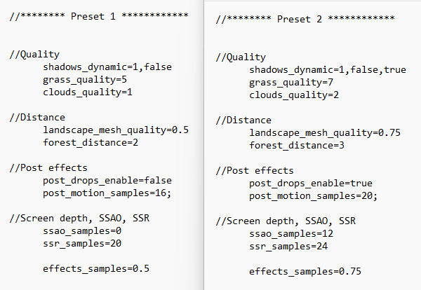 firdimigdi Posted December 11, 2022 Posted December 11, 2022 6 minutes ago, Youtch said: Is there any consensus about the difference between High and Balanced in terms of visuals? Or it just affects the bubble / distance at which trees are drawn? It's all in the \data\luascripts\gpresets.cfg file IIRC (you have to unpack this from some .gtp file. Here's a version of it I had lying around, not sure from which version of the game but you can follow which visuals are enabled/disabled and which have reduced quality: Spoiler //******** Preset 0 ************ [preset=0] //Textures settings Filter=3 texmipdown=1 land_textures=1 //Quality shadows_quality=1 shadows_dynamic=1,false //Quality, InGameEnable, Smooth reflection=2 grass_quality=5 forest_quality=1 landscape_parallax=0 smooth_effects=false clouds_quality=1 //Distance objects_distance=0.5 landscape_mesh_quality=0 forest_distance=1 //Post effects post_effects_enable=true post_bloom_enable=true post_contrast=true post_sharpen=false post_drops_enable=false post_hdr=0 post_motion_samples=0; saturation=1.0 //Screen depth, SSAO, SSR depth_res=1 ssao_res=-1 ssao_samples=0 ssr_samples=0 clouds_samples=64 effects_samples=0.25 [end] //******** Preset 1 ************ [preset=1] //Textures settings Filter=3 texmipdown=0 land_textures=0 //Quality shadows_quality=2 shadows_dynamic=1,false //Quality, InGameEnable, Smooth reflection=3 grass_quality=5 forest_quality=1 landscape_parallax=1 clouds_quality=1 //Distance objects_distance=1.0 landscape_mesh_quality=0.5 forest_distance=2 //Post effects post_effects_enable=true post_bloom_enable=true post_contrast=true post_sharpen=false post_drops_enable=false post_hdr=3 saturation=1.0 post_motion_samples=16; //Screen depth, SSAO, SSR depth_res=1 ssao_res=-1 ssao_samples=0 ssr_samples=20 clouds_samples=64 effects_samples=0.5 [end] //******** Preset 2 ************ [preset=2] //Textures settings Filter=3 texmipdown=0 land_textures=0 //Quality shadows_quality=2 shadows_dynamic=1,false,true //Quality, InGameEnable, Smooth reflection=3 grass_quality=7 forest_quality=1 landscape_parallax=1 clouds_quality=2 //Distance objects_distance=1.0 landscape_mesh_quality=0.75 forest_distance=3 //Post effects post_effects_enable=true post_bloom_enable=true post_contrast=true post_sharpen=false post_drops_enable=true post_hdr=3 saturation=1.0 post_motion_samples=20; //Screen depth, SSAO, SSR depth_res=1 ssao_res=1 ssao_samples=12 ssr_samples=24 clouds_samples=64 effects_samples=0.75 [end] //******** Preset 3 ************ [preset=3] //Textures settings Filter=3 texmipdown=0 land_textures=0 //Quality shadows_quality=2 shadows_dynamic=2,true,true //Quality, InGameEnable, Smooth reflection=3 grass_quality=7 forest_quality=1 landscape_parallax=1 clouds_quality=2 //Distance objects_distance=1.0 landscape_mesh_quality=1.0 forest_distance=5 //Post effects post_effects_enable=true post_bloom_enable=true post_contrast=true post_sharpen=false post_drops_enable=true post_hdr=4 saturation=1.0 post_motion_samples=24; //Screen depth, SSAO, SSR depth_res=1 ssao_res=1 ssao_samples=16 ssr_samples=30 clouds_samples=512 effects_samples=1 [end] As you can see between high and balanced you lose some eyecandy like reflection details, certain water drop effects, etc - also the scaling of the shadows is different - e.g. high quality shadows on the balanced preset means something different than it would with the high preset. 1
