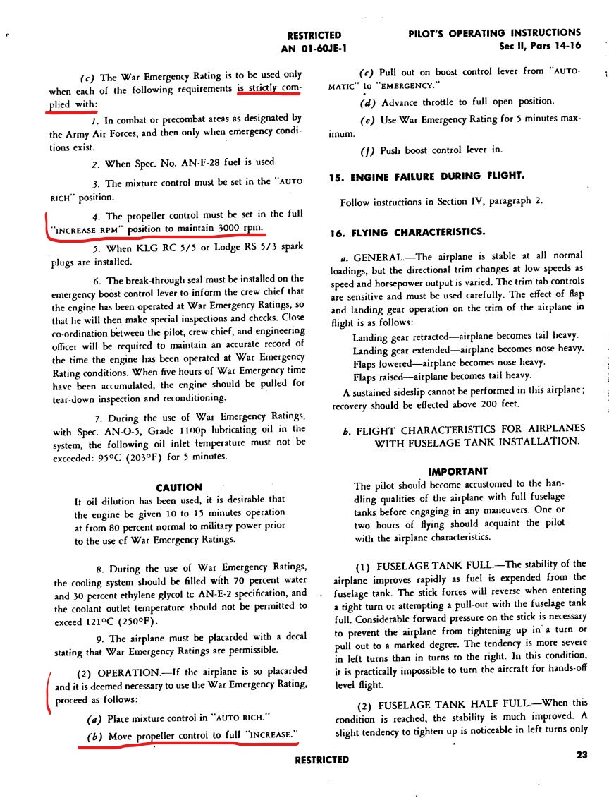 the_emperor Posted December 16, 2022 Author Posted December 16, 2022 From the P-51 D-5 Pilot´s flight operating instructions of April 5th ´44: WEP must only be used if rpms are set to full 3000. Rpms must always be set bevor increase of throttle to WEP. Also: the Engine ist allowed to accumulate a total time of 5h on WEP bevor tear down inspections (one more reason to give us the option to turn off the current mechanic)