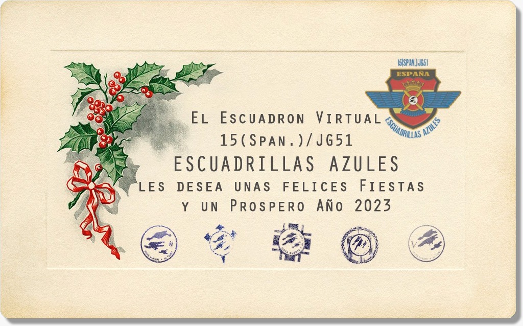 15[Span.]/JG51Costa Posted December 22, 2022 Posted December 22, 2022 (edited) Como cada año el Escuadrón Virtual 15(Span.)/JG51 os desea unas muy felices Fiestas y un Próspero Año Nuevo. Edited December 22, 2022 by 15[Span.]/JG51Costa 1