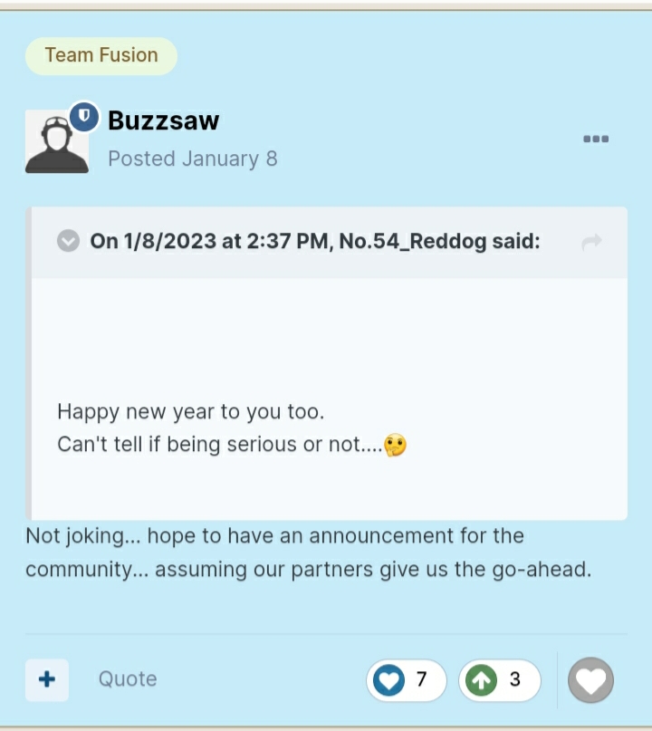 Team Fusion Buzzsaw Posted January 8, 2023 Team Fusion Posted January 8, 2023 7 hours ago, No.54_Reddog said: Happy new year to you too. Can't tell if being serious or not....? Not joking... hope to have an announcement for the community... assuming our partners give us the go-ahead. 7 4