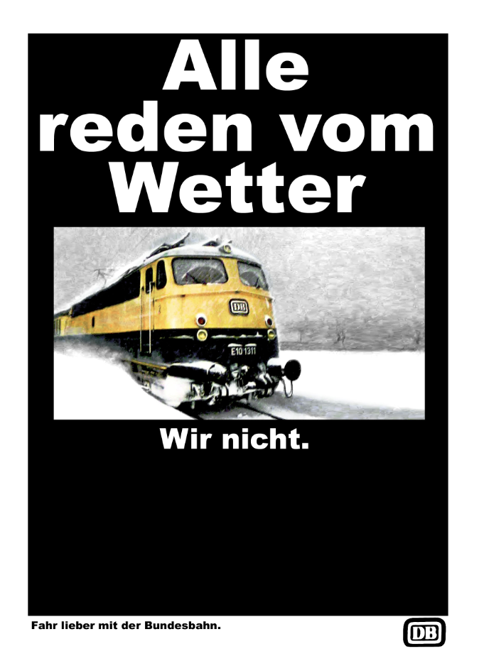 Eldur Posted January 25, 2015 Posted January 25, 2015 Der sollte sich mal Gedanken über das Wort Pünktlichkeit machen. Man konnte ja dem alten Staatsbetrieb vorwerfen, was man wollte, aber Pünktlichkeit war Ehrensache bei der Bundesbahn. Die heutige DB hat das nicht mehr. 5569_251a.png Hab gestern gelesen, dass die Weichen in NRW nicht beheizt wurden. Komisch, ich wusste schon 2-3 Tage vorher. dass es kalt wird und Schnee runterkommt. Die schaffen es nichtmal, sich auf sowas vorzubereiten. Wie sagt Malmsheimer? Früher war nichts besser, [...] aber es gab Sachen, die waren früher gut. Und das wären sie auch heute noch, wenn man die Finger davon gelassen hätte!