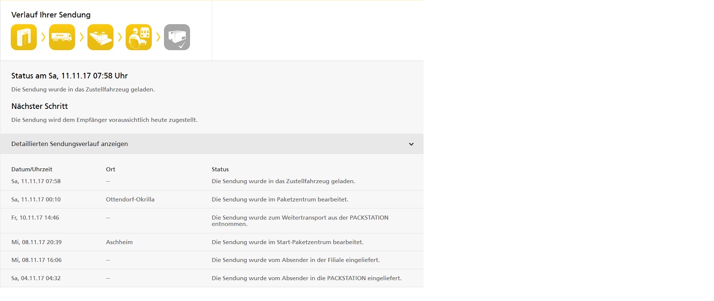 ram0506 Posted November 11, 2017 Posted November 11, 2017 DHL scheint ja wieder mal in Bestform zu sein. Letzten Samstag hatte ich eine Retoursendung über eine Packstation abgegeben, was ich wohl nie wieder machen werde. Vier Tage lag das Paket da drinnen, bis ich denen eine E-Mail geschrieben hatte, das Paket doch bitte mal zu entnehmen. Kaum ist eine Woche vergangen, schon kommt die Sendung an. Wobei..., nicht zu früh freuen, noch ist das Ding nicht zugestellt.