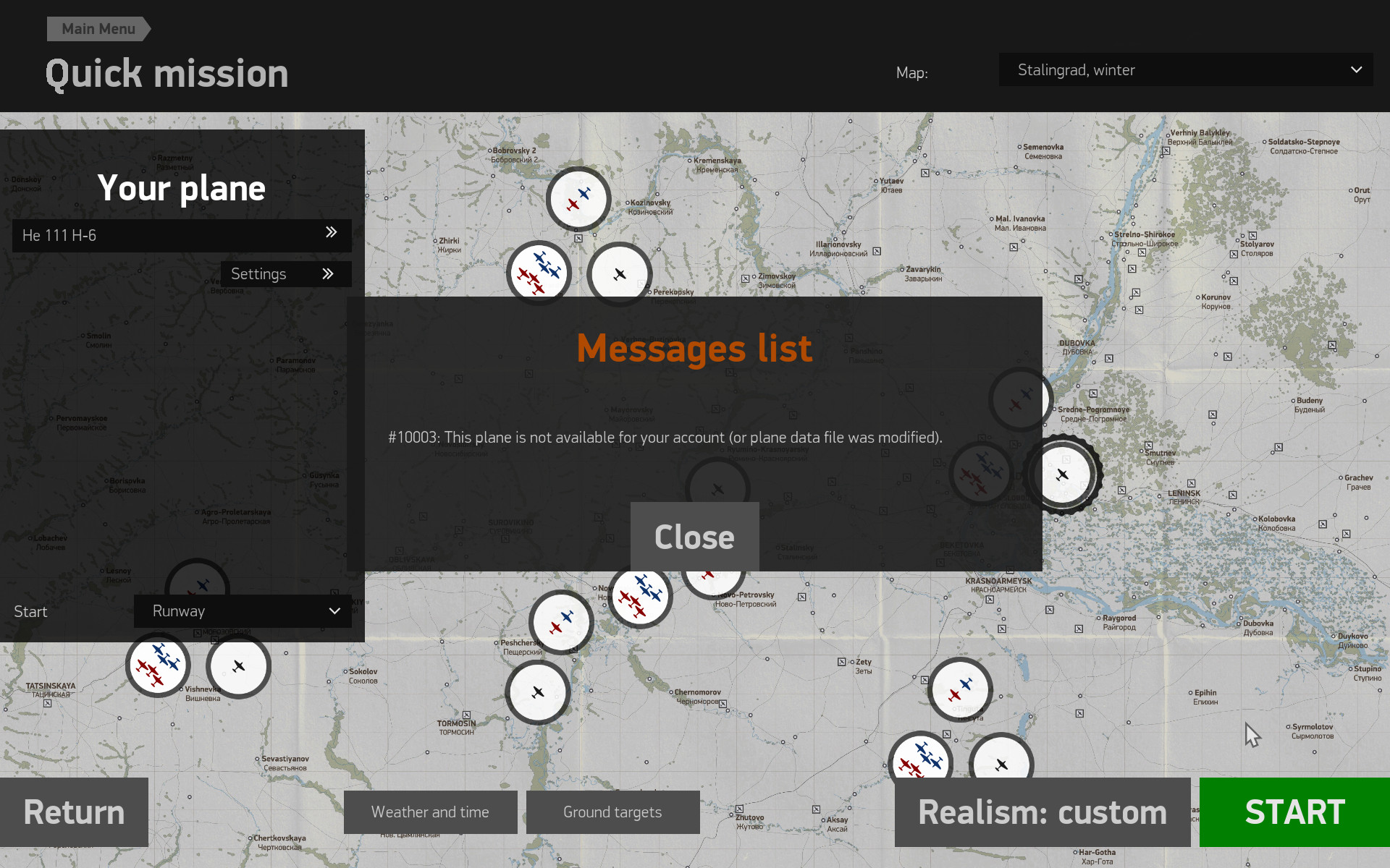 Gizmo03 Posted September 12, 2014 Posted September 12, 2014 (edited) Merkwürdig. Bei mir geht alles - inkl. der Heinkel. Ups....edit: Ihr habt recht. Ich dachte, die taucht bei Euch garnicht erst in der Liste auf. Wenn ich die He 111 wähle geht alles. Klicke ich dann auf Start geht's auch beim mir zurück ins Hauptmenü mit der Meldung, dass die 111 nicht verfügbar ist. Edited September 12, 2014 by Gizmo03