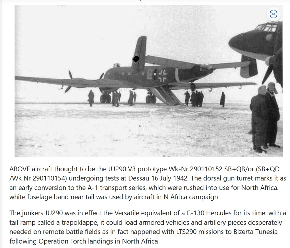 Schmehl Posted February 10, 2023 Posted February 10, 2023 (edited) I am getting a kick out of trying to figure out the history of this plane and I think I have pieced it together. Here are the main bits of info I found that seem to connect the dots. 1. The Ju 290 was developed from the Ju 90 airliner and made its first flight on July 16, 1942. 2. The two last Ju 90 prototypes – the V7 and V8 – fed directly into the Ju 290 development program. The former had a fuselage extension of 1.98 m (6 ft 6 in) and the addition of dihedral to the tailplane to solve a yaw instability. 3. Some of the Ju 90s were converted into prototypes of the bigger Ju 290 transport and reconnaissance aircraft. The more powerful engines and other modifications to the Ju 90 V5 and V7 were steps in this direction and the latter was converted into the Ju 290 V3. I also located a list of what happened to the Ju 290s and found: J900152, Ju290 V3 / A1 LUFTWAFFE, SB+QB (also J4+AF, GF+GH), Okt. 42 to Apr.43, crashed in Megrine, Tunisia Looking at the history of the 325th Fighter group I found: 325th Fighter Group - Activated on 3 August 1942, the 325th Fighter Group moved to North Africa during January-February 1943 and were assigned to the Twelfth Air Force. Their first combat was on 17 April 1943. Their mission was to escort medium bombers, fly strafing missions, and make sea sweeps from their bases in Algeria and Tunisia. In summary, it appears that the Ju 90 V7 prototype was marked as J4+AF and later GF+GH. It was converted into the Ju 290 V3 prototype marked as SB+QB by giving it a fuselage extension, addition of dihedral to the tailplane (visible in the crash photo), and more powerful engines. Interesting that the 1st flight of July 16, 1942 mentioned in point 1 above is the exact date mentioned in the photo above. I can’t find anything about why the Ju 290 crashed in Tunisia in April 1943, but it does align with the 325th being there. If you look between the SB and QB right in the center of the balkenkreuz of the crash photo, there is a “152“. The Ju 290 that crashed in Tunisia is listed as J900152. And the photo of testing above lists it as Wk-Nr 290110152. It seems likely that the crashed photo was taken in Tunisia and it is the Ju 290 V3. Edited February 10, 2023 by Schmehl 1