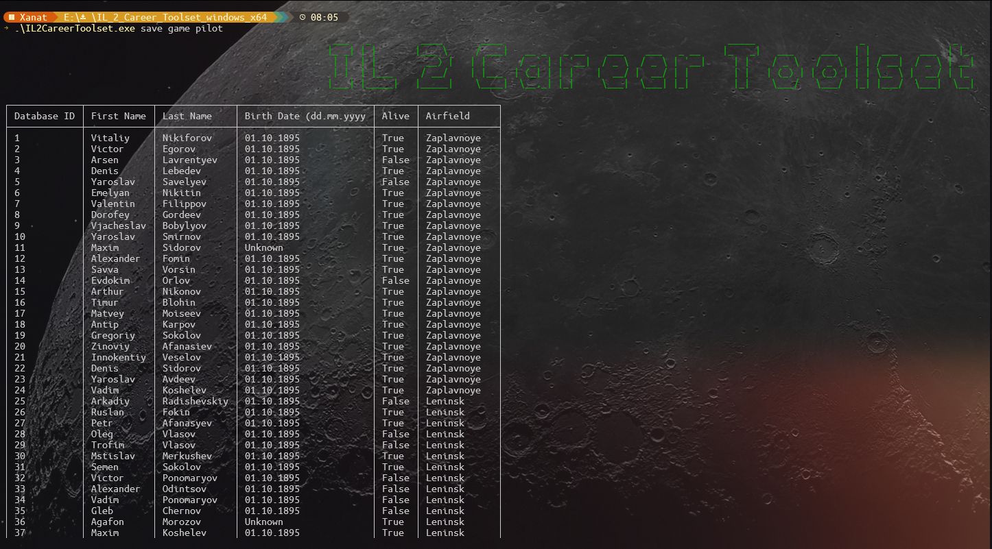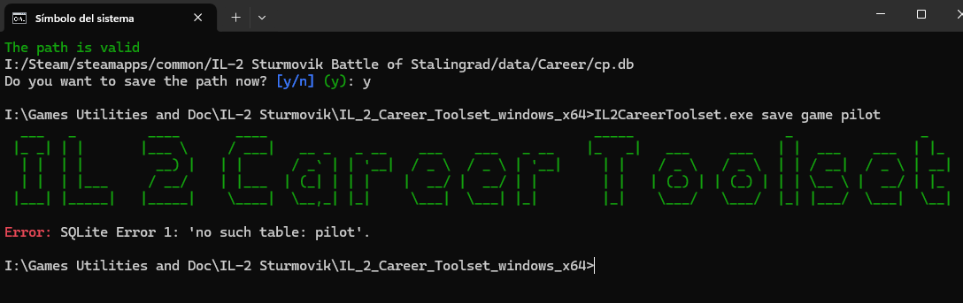 Xanatos Posted May 15, 2023 Author Posted May 15, 2023 (edited) On 5/12/2023 at 9:22 PM, Rudolph said: I was able to set the pat, however if I enter the command .\IL2CareerToolset.exe save game pilot it shows me an error> 'no such table: pilot' Is there more infomation to the error message you could post as a screenshot or as plain text? It reads to me like the tool cannot find the database table named "pilot" which is strage. It's still working for me at least so either you database got an issue or something changed which I'm not aware of. I do not thing that the did rename a table that wouldn't make sense to me. Please send the full error stack if possible otherwise I think it will be hard to diagnose the issue. As you searched for the game database was the entry listed like that or something similar ending with the `Career\cp.db` part? Edited May 15, 2023 by Xanatos