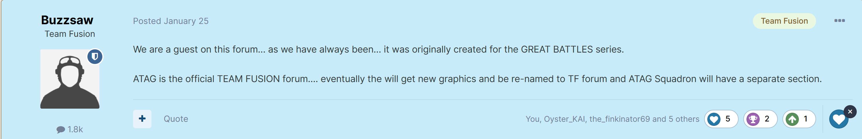 343KKT_Kintaro Posted March 13, 2023 Posted March 13, 2023 5 minutes ago, BOO said: 1GCS is green - Daidalos, as far as I am aware are not connected to TFS officially but may potentially share members i suppose. Thank you BOO, I just noticed that the blue, white or green colours applie to the background of their posts in the forum. At first I thought you were talking about the shield icon. The shield-shaped badges remain blue for all of these guys. For example: 1) Han (1CGS IL-2 producer): green background on his posts and blue shield badge on the avatar. 2) Wardog5711 (1CGS IL-2 community manager): green background on his posts and blue shield badge on the avatar. 3) Buzzsaw (TFS CEO): blue background on his posts and blue shield badge on the avatar. 4) LukeFF (forum moderator): white background on his posts and blue shield badge on the avatar.