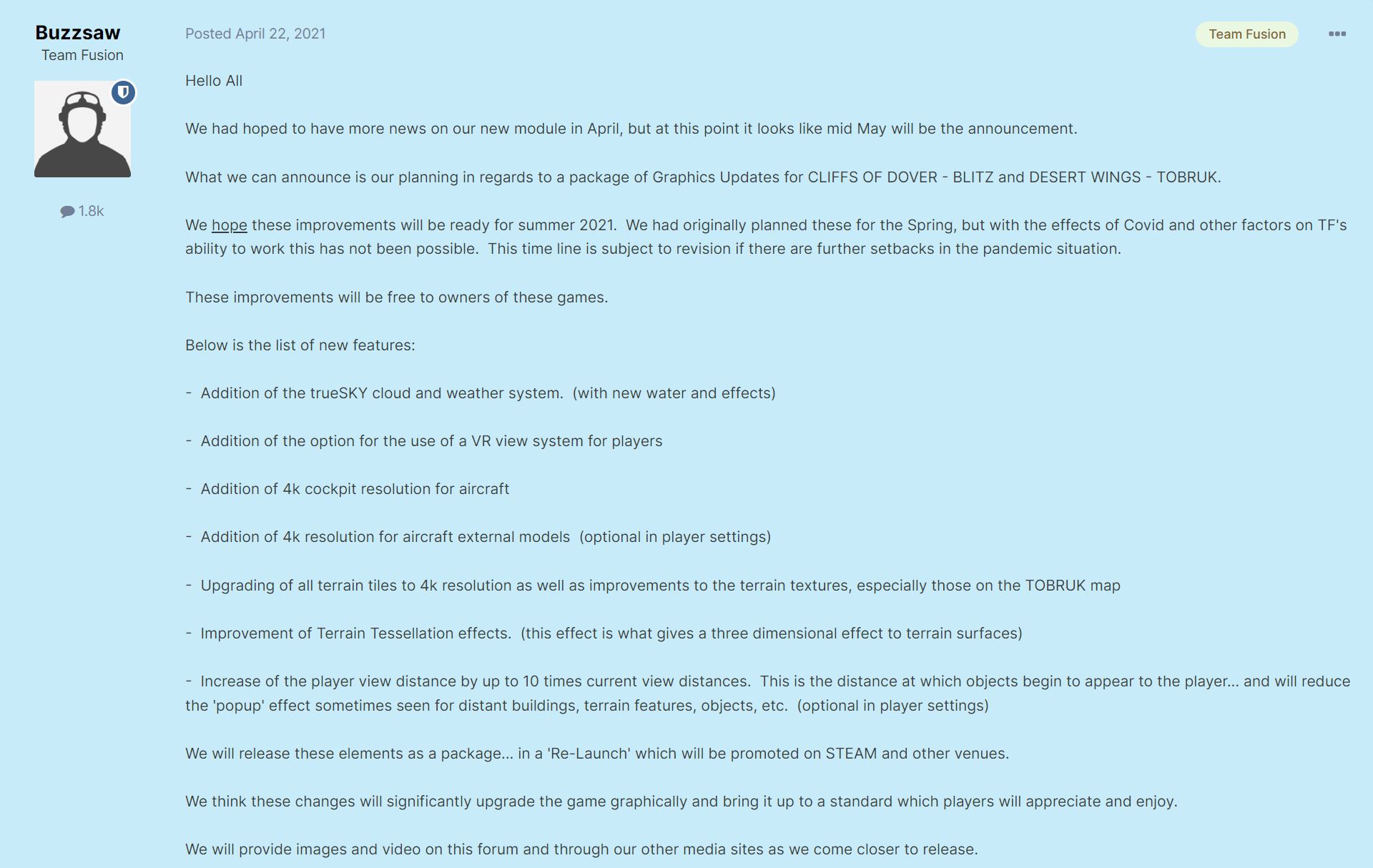 Mysticpuma Posted March 1, 2023 Posted March 1, 2023 Just now, Snowdon said: Guys what do you thing the likely hood is that we see an open beta, Maybe even a launch in the next 6 months? Or do you thing clod is DOA? I don't see it happening in 6 months, I think we are all heading on the rollercoaster ride towards Christmas 2023 which we had 'hoped' for being Christmas 2022. Let's take into account Buzzsaw's last main update about the current state of play: "There has been a lot of speculation regarding the status of Team Fusion, the CLIFFS OF DOVER engine, and whether the recent changes in ownership and management at 1C might affect our project. To clarify: As of 2023, Team Fusion Simulations continues to exist, our contract with 1C/Tencent continues to be current, we continue to work on the development of the CLIFFS OF DOVER game engine, and we intend to complete both the Visual Update and our next module. (TF 6.0) We will certainly update the community when anything relevant to the above occurs. Thanks to everyone for their patience." Given that, we must deduce that in 2-months nothing relevant has happened. 2-years-ago the graphics update, VR and Truesky were expected by the summer, this has obviously failed completely: a small update followed: Then a final one: And that was it. No May announcement (apparently curtailed by 1C refusing to let them announce the v6 module which seems to be the current state of play but without any news, just a guess) @Snowdon in regard to "Maybe even a launch in the next 6 months? ", the development pace of CloD has been so poorly communicated it is impossible to even know where the Team are and even if there are any team members still left to work on development. Buzzsaw is heavily invested in the software, I think there are a couple of coders, but in terms of models, maps and any assets, these must surely have been completed months ago for v6 (if and when it is ever released). Let's look at the true situation. The player base is barely existent now. Years (literally) of delays in producing anything said in the April 22nd 2021 update have hurt the existing player base, especially online. There are only so many times you can resell the current state of CloD with no new features before people start seeing through the "Emperor's New Clothes". "Hope, expect, aim, intend, would like", etc, etc these just don't cut it any more. Surely by now someone on the team can look at the current state of progress and say "barring any major setbacks we will look at releasing in the first week of August, but if that isn't possible we will be clear and open with the community about the reason for the delays". That is the bare minimum a company who have taken finances from players on the promise of the updates above should at least be looking to provide. The current status is to blame anyone on the official forums for daring to ask "what is actually going on with this!?" as this takes much needed development time away from someone spending 20 minutes updating the community once every month.....I mean, imagine daring to ask for 12 updates in a year.....after years of delays have gone by with nothing of note released apart from more screenshots of software that is alleged to exist. Ultimately, we are nowhere further forward in knowledge than we were in April 2021 as to knowing when this mythical update will ever see the light of day. The consequence of this though is who will invest in a pre-order for module v6 if the communication of a free update has been so tragic and so delayed? I ask simply because getting new players to invest in the next module based on "hope, expect, aim, intend, would like", just won't cut it after this amount of time, it will even be a struggle to get owners of the current software to invest with the disdain shown to the community by the ongoing empty (invisible would be more factual?) words of the team. The wait continues, but sadly it feels more like morbid curiosity than excitement. 1 1 2