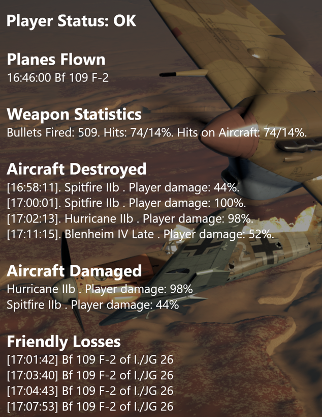 Bussard_x Posted March 22, 2023 Author Posted March 22, 2023 On 3/19/2023 at 4:46 AM, 343KKT_Kintaro said: At the end of the mision, some aircraft made it, not that they necessarily went back to their airfields, but they weren't counted as destroyed when you stopped the mission. Out of those that made it, at least two of them were damaged by you: "Hurricane IIb . Player damage: 98%": on this specific damaged Hurri, 2% of the damage was caused by other planes and 98% of the damage came from your attacks (bullets, shells, bombs, accidental collisions, on-purpose collisions... or whatever things you made so that the aircraft ended up receiving the damage it received). Spitfire IIb . Player damage: 44%: on this specific damaged Spitfire, 56% of the damage was caused by other planes and 44% of the damage came from your attacks (bullets, shells, bombs, accidental collisions, on-purpose collisions... or whatever things you made so that the aircraft ended up receiving the damage it received). Okay, but the 44% should only be under Aircraft Damaged and not under both. This is a bug from 2011 release.