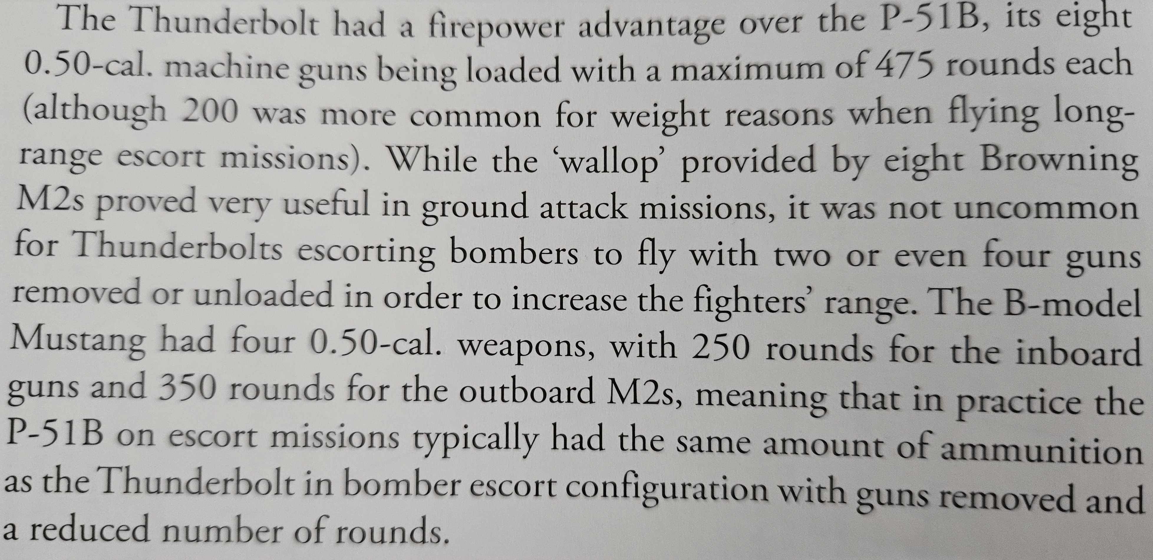 Skycat1969 Posted June 1, 2023 Posted June 1, 2023 Let's begin with assurances that P-47 pilots were given during the war, directly from the 1945 USAAF training manual: Quote "... Fighters will make an increasing number of attacks on ground targets .... The P-47 is a grand plane for this type of warfare. Terrific firepower keeps the enemy ducking, and the plane's heavy construction withstands savage punishment. Plenty of pilots in the ETO call the P-47 the best fighter in the world for low-altitude work." "You are protected by a face-hardened steel plate behind and in front of the cockpit seat and bullet-resistant glass in front. The engine, supercharger and gas tanks are an added shield." "When making a forced landing, keep your speed up even though the terrain is rough or wooded. A P-47, which is built like a bulldozer, will plough right through." Even allowing for some confidence-boosting hyperbole, there is indication here that the real aircraft was more than a fat, waddling target. IMO the P-47 in the game should have a more durable motor. I've had engines seize caused by exploding trucks during a strafing run. It seems to me that motor is too fragile or that it is too easily destroyed by energy directed at the cockpit area of the fuselage. Any ballistics to the upper cowling is fatal. This is where I agree with statement that the P-47 should be on a parity with the IL-2: It should at the very least be slightly better able to survive a strafing run against an armed train than a Mustang or Spitfire -- but I'll concede that is just my opinion. Another 'probably just my opinion' is that the game's P-47 doesn't produce enough power for its weight; perhaps this is a game-ism to force it to be a slow climber or to hobble it as a dogfighter. The conventional wisdom of the community is, "it performed poorly at low altitude and that's reflected in the sim." I'll have to do some scientific comparisons but it has always struck me how much of a dog the P-47 is at, say 2000 feet, using full throttle and full turbo while the P-51 just glides along and achieves the same speed at half throttle or less. So how does this behavior compare to a contemporary comparison between a P-47D and P-51D? Consider this: Quote "We flew a formation take-off with the Thunderbolt and Mustang last year. Jon Gowdy was in the P-47 and I was in TF-51 Contrary Mary. I thought, I'll build up power on the brakes and release as soon as the Thunderbolt starts to roll. I expected I would need to come back on the power, and would end up getting airborne before the P-47. It was the polar opposite! The second he let his brakes off, I released mine and it was like nothing happened in comparison -- I was sat watching the P-47 disappearing off down the runway! I put on as much power as you'd want to put on the Mustang, and he was airborne before me. The Mustang cleans up faster than the Thunderbolt, so I closed the gap as the undercarriage was retracting on both aeroplanes, but the second the wheels were up the P-47 just went. It was a good 10kts faster and I eventually had to ask him to come back on the power as I was giving it everything and couldn't catch up!" From Richard Grace on flying P-47D Thunderbolt 'Nellie B' (vintageaviationecho.com) Again, I know this is just anecdotal evidence and certainly it provides an incomplete portrayal of the two aircraft at that. It does however lend to my suspicion that the game's P-47 is underpowered. Or rather, powerful just enough to haul an undamaged aircraft around. 2