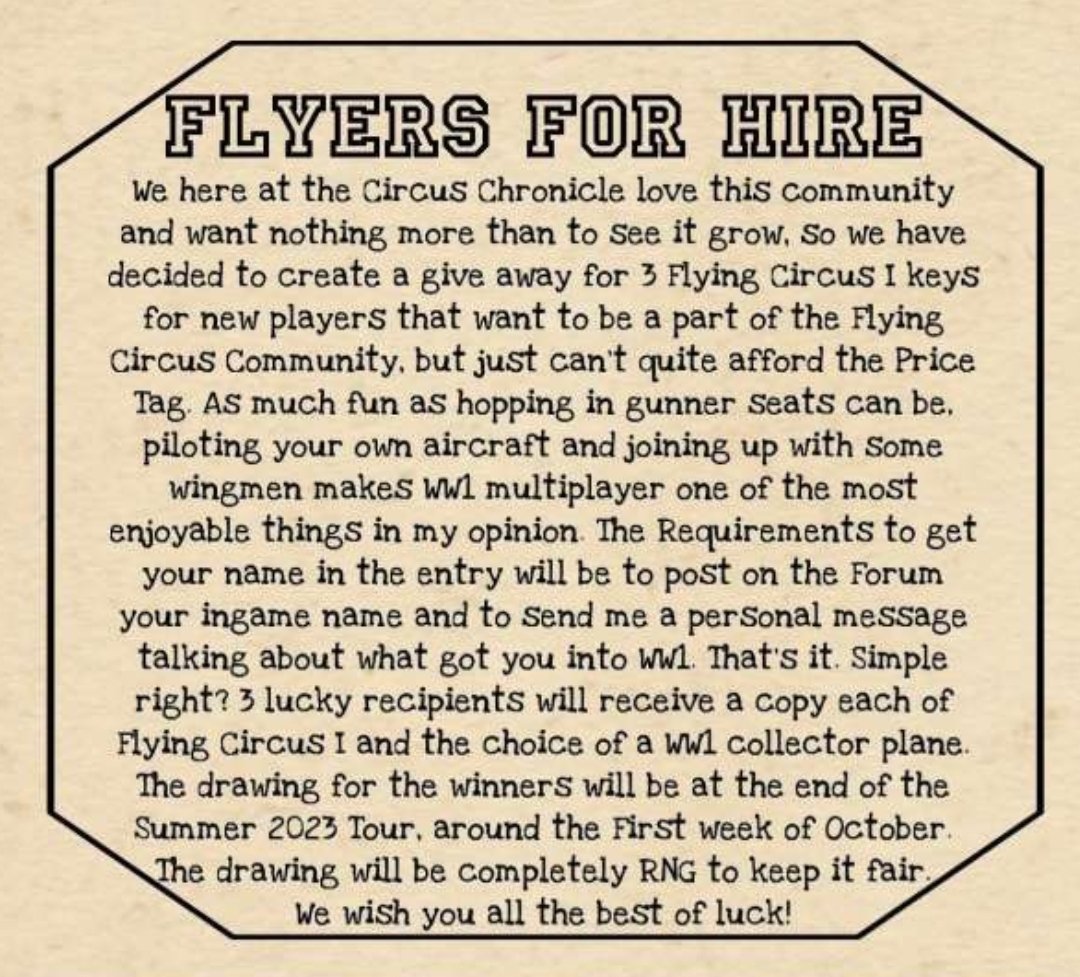 US103tRoosevelt Posted August 7, 2023 Posted August 7, 2023 Good evening gents. My name is tKestrel, Lead Editor on the Circus Chronicle, the premier Newsletter for the WW1 Community. We, at the Circus Chronicle, love the community that we make the paper for and would love to give some lucky players the chance to enjoy the WW1 creatures of the air with us. Have you ever wanted to participate in the WW1 side of IL2 Great Battles, but cant justify spending your hard earned money for something you dont know if you will like, or maybe you have checked out the WW1 stuff via a gunner seat, but never got to fully experience the dogfights in the pilots seat. Well, now you are in luck! The Circus Chronicle is sponsoring 3 keys to give away for new WW1 players. Try to get the word out. Im hoping to give them out at the start of the next tour which starts on Oct 1st. Also, if you are interested in meeting some of the guys in the WW1 community before you consider joining. Feel free to check out the WW1 Flugpark Discord at https://discord.gg/k4mUCaWv73 We are always happy to meet new members and have extensive experience to offer any new comers as well as members of the community that are willing to teach 1 on 1 how to fly and survive in WW1. 5 3