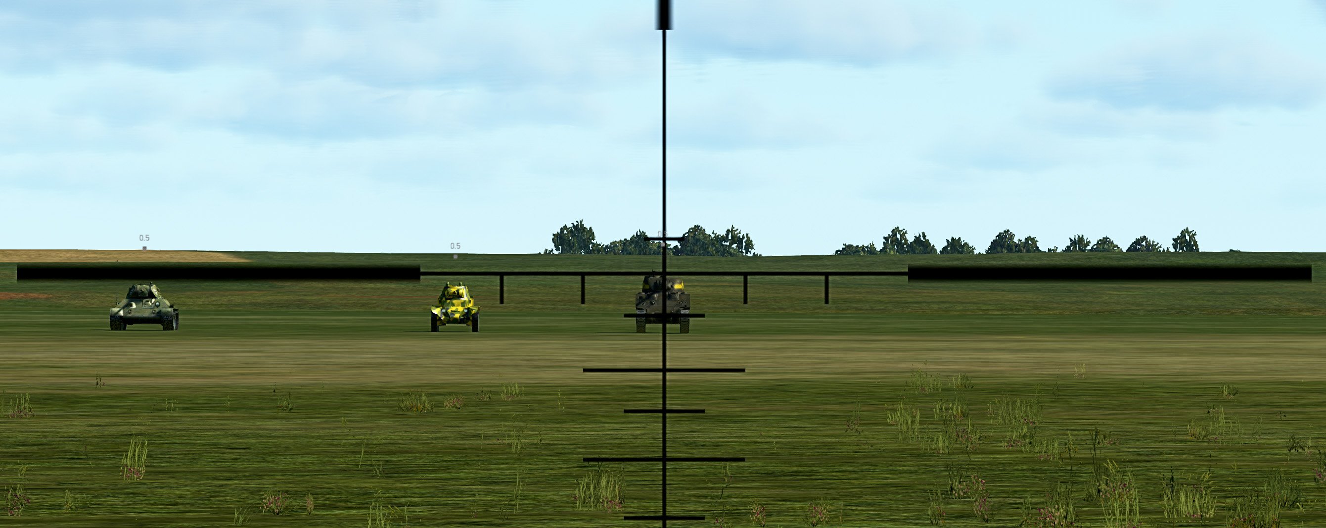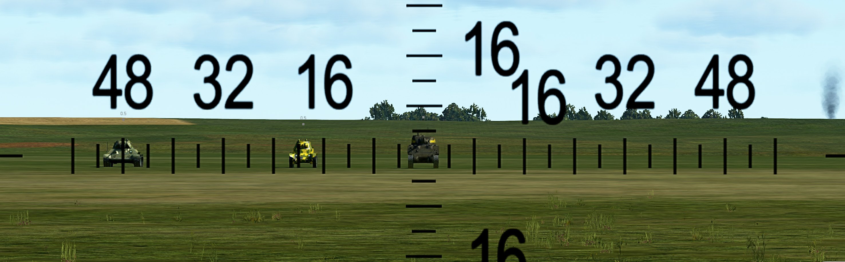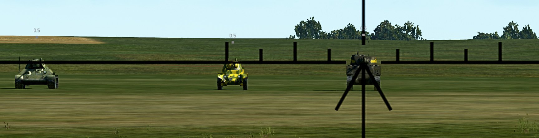 MajorMagee Posted August 30, 2023 Author Posted August 30, 2023 (edited) The vehicle spacing is 10m and 15m center-to-center at 500m distance. 10m is 20 mils at 500m. (15m is 30 mils, and 25m is 50 mils) The Sherman was at the center of the field of view before cropping. German Bino 5-10 mils Panther 4-8 mils PzGr.39/42 scale is AP, Pak Gesh 40/42 scale is APCR, Sprgr.42 scale is HE (and MG) M4A2 10 mils (Circle Diam., Horizontal Bar Lengths, and the Distance from the Dot to the Inside Edge of the Bars) Tiger MG 4-8 mils Tiger 4-8 mils Churchill MG 8 mils Churchill 8 mils Su152 4-8 mils From the station notes: The range scale on the left works for the HE only. None of the scales are correct for APHE, you have to watch the text on the right as you make adjustments to know what you have the distance set for. Pz IV and Pz III 4-8 mils Pz IV Pzgr 39 scale is AP, Pzgr 40 scale is APCR, Gr 34 u MG scale is HE and MG, Gr 38HL/C is HEAT Pz III Pzgr scale is AP, Sprgr scale is HE (and MG) KV-1 and T-34 4-8 mils СГ - "Старая Граната" (Staraya Granata/Old Grenade) it is for Ф-354(F-354) HE round with 640 m/s muzzle velocity ДГ - Дальнобойная Граната(Dalnoboynaya Granata/High range grenade) - for ОФ-350/350А (OF-350) HE round with 680 m/s ДТ - machine gun Дегтярева Танковый(Degtyareva Tankovy/Degtyarev's for tanks) with 840m/s muzzle velocity. KV-1 and T-34 Second Sight APHE БР-350Б (BR-350B) have 655 m/s velocity. Su122 4-8 mils Su122 Commander 4-8 mils Stug III and Elephant 4-8 mils Soviet Bino 5-10 mils Edited September 2, 2023 by MajorMagee 1