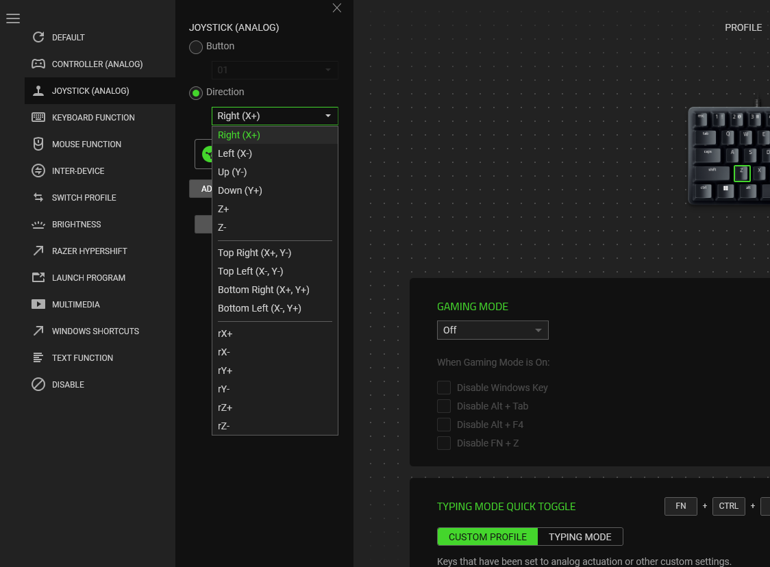 RossMarBow Posted September 17, 2023 Posted September 17, 2023 Optical keyboard switches allow full analogue response. i.e. on this razer huntsman optical 60% I purchased which by the way is an excellent deal on amazon, I'm not supporting amazon or razer, but I was surprised on the value for $50 USD my mouse also uses optical switches The benefits of optical switches is usually touted as a reduction in response times due to not requiring the software 'debounce' filtering that mechanical contact switches require Impossible to confirm yet but they should also last longer? Though I seriously doubt anyone has ever worn out a mechanical switch before so that is probably entirely moot also thank the lord none has a patent on optical switches it seems every brand seems to have the ability to design an optical switch I believe theirs also a bunch of open source drivers controllers etc. (with other brands) I'm not 100% sure of the tech behind it but I believe they will replace mechanical switches entirely except for maybe really small switches? While I know VKB/Virpil don't seem to be using them at the moment? The fact that you could make a lot of switches and buttons on throttles and joysticks analogue is good back to this razer keyboard by 'default' it lets you turn your wasd into a joystick, while the Q and E keys function as triggers would on a xbox or dualshockwarning some games will think you have a controller plugged in and block off keyboard and mouse input (I don't think this will be a problem at all in IL-2 WT DCS though) in theory in the future the majority of gamers will have access to something similar to this I'm not saying this is going to replace joysticks and rudders but you might be getting shot down a lot by someone using purely keyboard and mouse, sooner rather than later this will greatly increase the number of players who get a good taste of flight sims and become hooked using the software you can also rebind other keys to have an analogue output which might actually be useful today and now even if you have a stick and throttle, this functionality could be useful to someone I have not actually tried this out in anything yet but I can imagine this might lower the barrier of entry into flight sims someone has probably tried this out in WT and might be able to compare it to mouse The software has a prebuilt setup for emulating a normal stick and triggers but as seen below you can make any and every switch analogue now before you think this is crazy talk the switch only has 3.6mm of throw how accurate can you be? well I can't actually tell you, but from what I have read online its good enough for controlling movement in fps and razer has said its good enough to drive a car with so \0/ Practical application to IL-2 rudder input flaps? can you bind flaps to an access? wheel brakes anything else that you would want to bind to an 'axis' and don't mind having it return to the 0 or 100% position every time