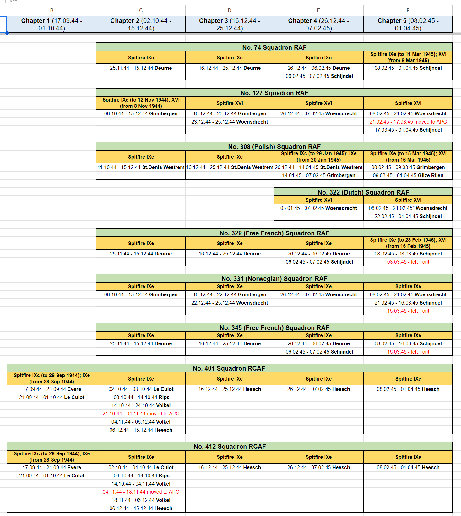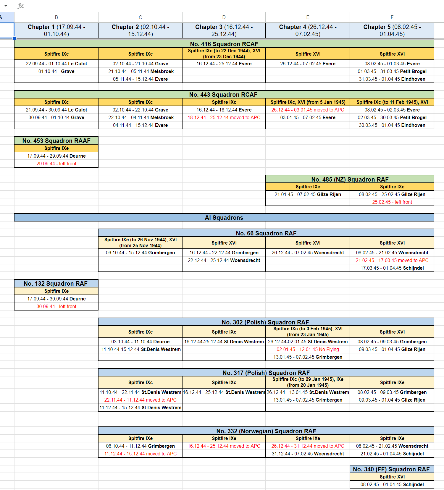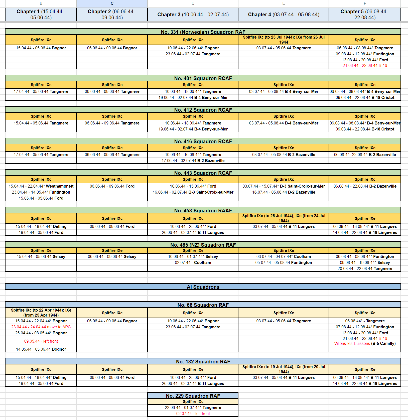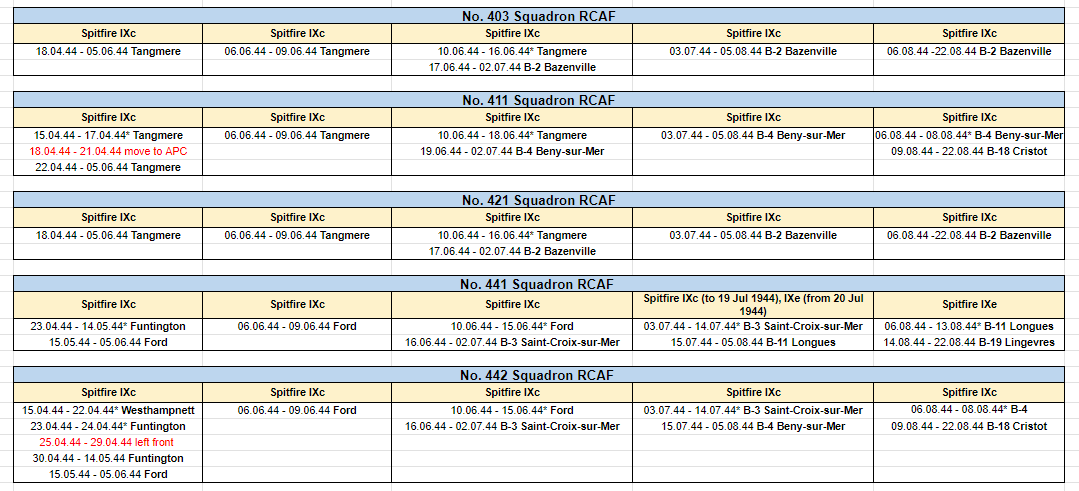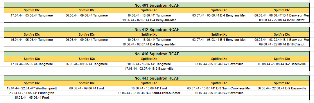Stonehouse Posted November 4, 2023 Posted November 4, 2023 (edited) Think 453 SQD RAAF is not quite right. They had Spit IXBs for the invasion and received the first LF IXEs July 17, 1944. I guess if your purpose is to give a reasonable substitute in game terms then you're ok. Apparently, 485 RNZAF is similar except they kept their IXBs until Feb 1945 when they converted to Tempests with some Typhoon 1Bs in the mix for conversion training. Seems they then reverted to Spitfire IXBs in April 1945 converting to XVIs in May 1945 which they kept until they were disbanded Aug 26, 1945, like most of the other Article XV squadrons which were disbanded around the same time. See https://www.radschool.org.au/Books/Defeat-to-Victory-No-453-Squadron-RAAF.pdf page 105 onwards for about 20 pages. Possibly some of the basing dates and locations slightly off too. Haven't had time to collate bases from the reference above to cross check the following but here http://www.historyofwar.org/air/units/RAAF/453_wwII.html shows slightly different time periods and places. 485RNZAF http://www.historyofwar.org/air/units/RNZAF/No_485_sqn_RNZAF.html Edited November 4, 2023 by Stonehouse