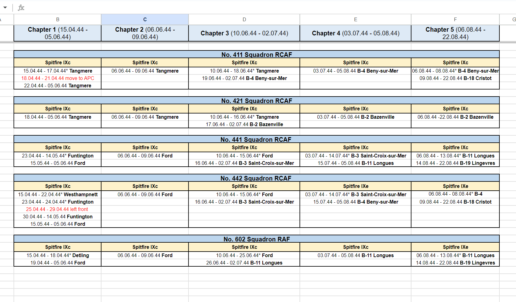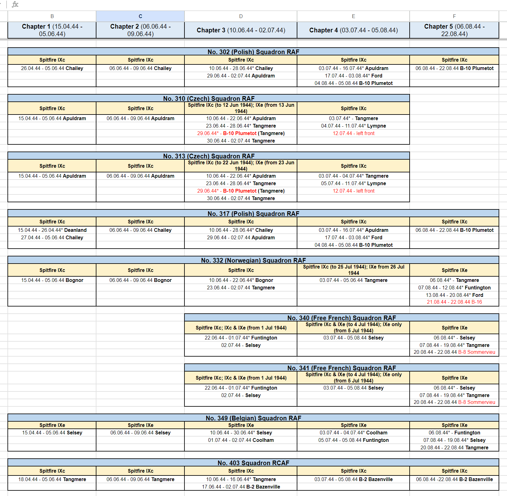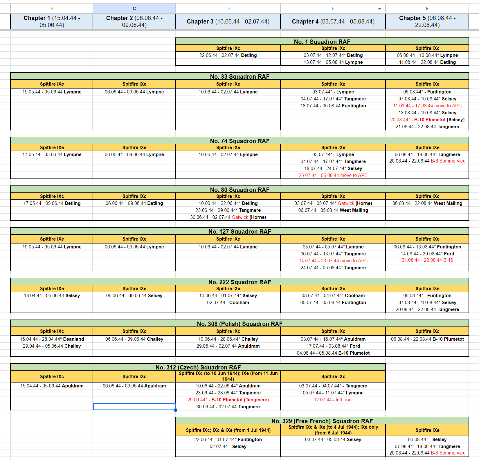 Stonehouse Posted November 4, 2023 Posted November 4, 2023 (edited) Think 453 SQD RAAF is not quite right. They had Spit IXBs for the invasion and received the first LF IXEs July 17, 1944. I guess if your purpose is to give a reasonable substitute in game terms then you're ok. Apparently, 485 RNZAF is similar except they kept their IXBs until Feb 1945 when they converted to Tempests with some Typhoon 1Bs in the mix for conversion training. Seems they then reverted to Spitfire IXBs in April 1945 converting to XVIs in May 1945 which they kept until they were disbanded Aug 26, 1945, like most of the other Article XV squadrons which were disbanded around the same time. See https://www.radschool.org.au/Books/Defeat-to-Victory-No-453-Squadron-RAAF.pdf page 105 onwards for about 20 pages. Possibly some of the basing dates and locations slightly off too. Haven't had time to collate bases from the reference above to cross check the following but here http://www.historyofwar.org/air/units/RAAF/453_wwII.html shows slightly different time periods and places. 485RNZAF http://www.historyofwar.org/air/units/RNZAF/No_485_sqn_RNZAF.html Edited November 4, 2023 by Stonehouse