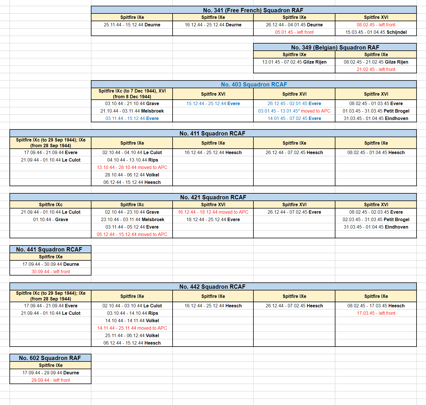 -332FG-MickX Posted November 3, 2023 Posted November 3, 2023 (edited) 125 Wing swapped over their Spitfire IXe's with 126 Wing RCAF over September 28th & 29th 44. This happened when 125 was pulled off tour on the 29th to commence a new tour diving bombing V2 sites from the UK. The IXb's from 126 were ferried back to the UK back returning 125 wing pilots for much needed maintenance. Edited November 3, 2023 by -332FG-MickX