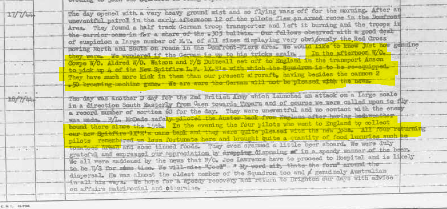 1CGS LukeFF Posted November 3, 2023 Author 1CGS Posted November 3, 2023 7 hours ago, -332FG-MickX said: No. 453 Squadron sent pilots back to the UK from B11 on the 17th (4) and 19th (5) 21st (2) and 25th of July (amount not listed) to re-equip the squadron with Spitfire IXe's. No conversion course is documented, just a note that the pilots took advantage of a lull in operations due to rain to "try them out" on the 20th and were flying with them operationally on the 23rd when the weather cleared. All figures quoted from entries from the 453 Squadron Operations Records book. Thank you for that! I have their logbooks but hadn't yet read the entires for July. That is very helpful.