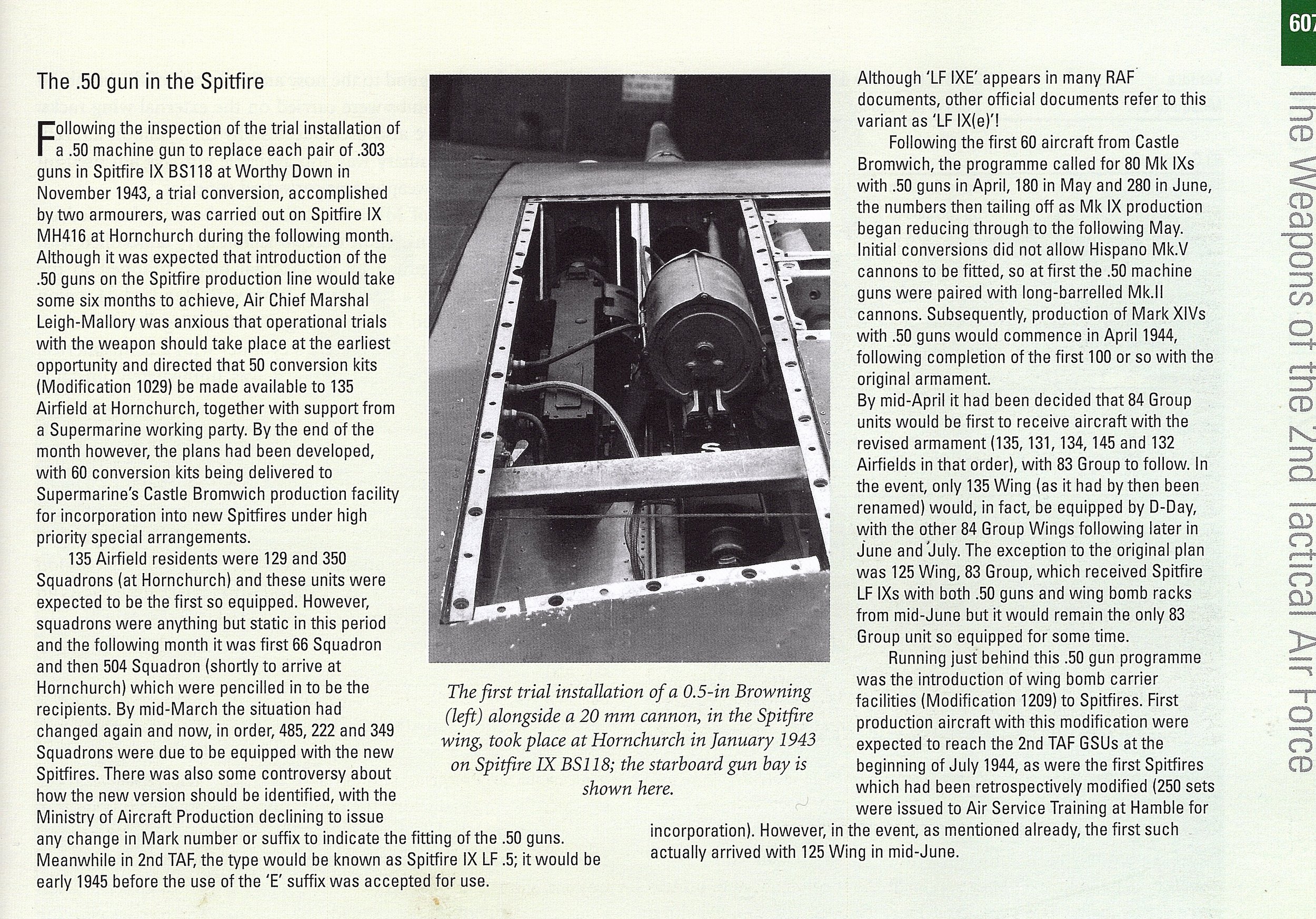 NZTyphoon Posted December 26, 2023 Posted December 26, 2023 (edited) On 11/8/2023 at 7:42 AM, Lythronax said: Just to clarify the names: although IXc is a useful descriptive term, only "LF IX" and "LF IX(e)" are official designations. The Mk IX did not have a "C Wing" in the Mk Vc sense as it was not universal, so no suffix was used until the Mk IXe came along, when one was needed. Mk IXA/IXB refer to Merlin 61/63 and 66 engined aircraft respectively and were designations singly used in unofficial/squadron settings. Before the F/LF/HF designations came into official use in May 1943 the official terms used by the RAF were Mk IX and Mk IX (66)/(Merlin 66). I would expressly advise not using the IXA/IXB designations as they are not correct nor official, and only add to confusion with the early a/b/c designations of the Mk I, II and V! The MAP declined to issue a new suffix to the Spitfire IX w/.50 cal, thus there was no Official "E" designation until early 1945: before that, the unofficial designation in 2 TAF was Spitfire IX LF .5. This was explained by Christopher Shores and Chris Thomas in 2nd Tactical Air Force : Volume Four - Squadrons, Camouflage and Markings, Weapons and Tactics 1943-1945 453(RAAF) Sqn, Ford: 412(RCAF) Sqn, Volkel 27 October '44 Edited December 27, 2023 by NZTyphoon add correct link/ delete extra page 3