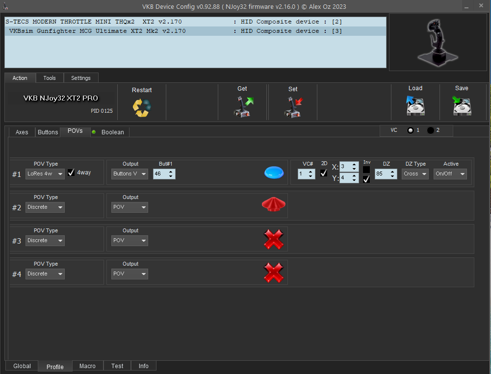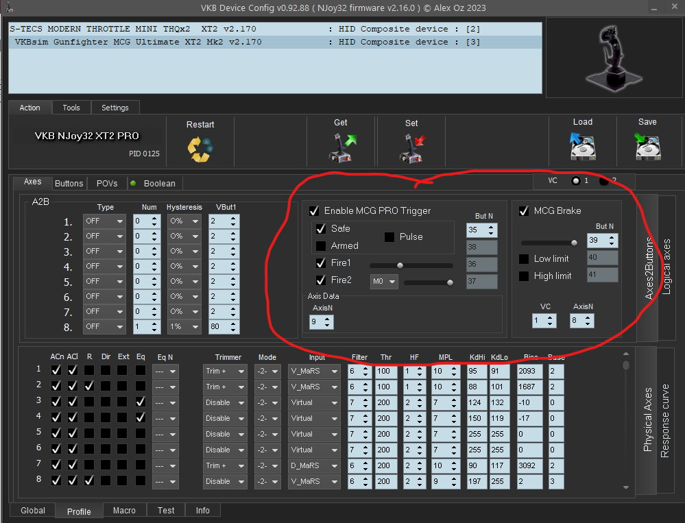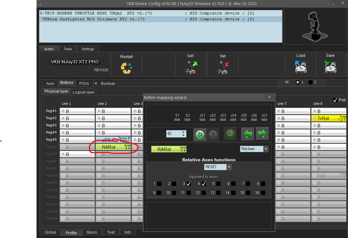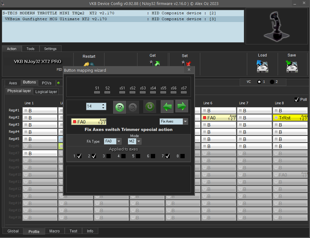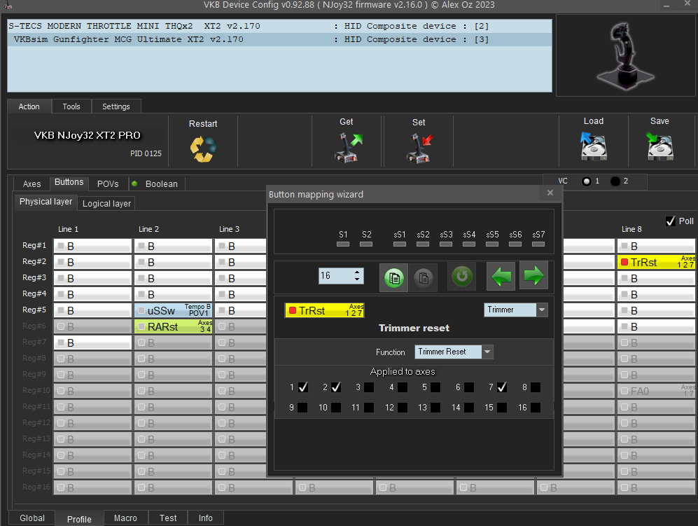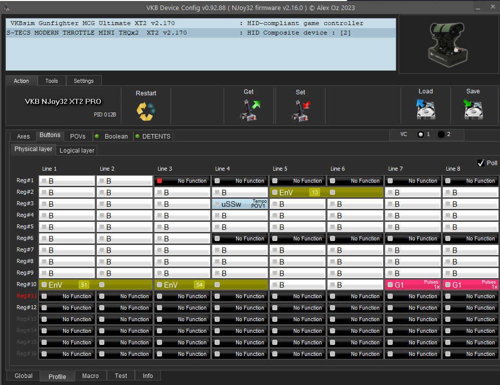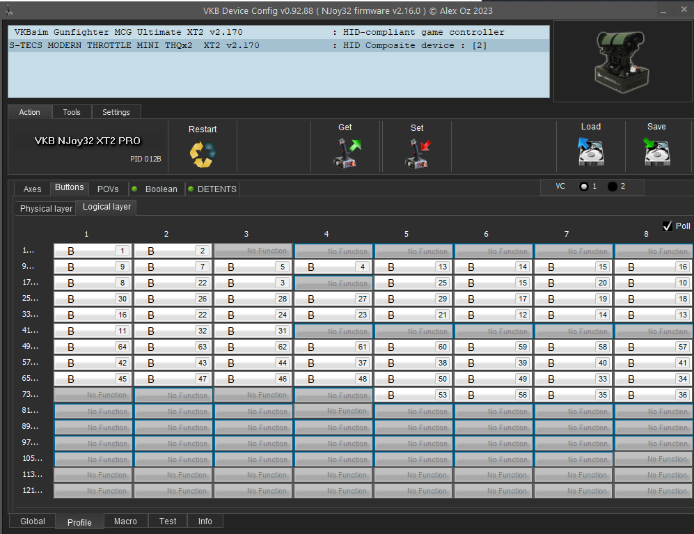 SBGGDoggyC Posted November 12, 2023 Posted November 12, 2023 128 buttons support would be nice BUT if you have VKB gear...in DevCfg you can create a new profile for your device and set it to 64 buttons in global settings. Then take some time and make sure no logical buttons go above button 64. I spent an hour setting assigning each physical button to logical 1-64 and i was able to cover every single button on my STECS Standard...and that's with adding 2 4-way hats with pushbuttons. I didn't mess with virtual controllers for the other buttons...no real need in IL2. Did the same for my MCG-Ultimate too...so now I just load those profiles when I play IL2 and load my normal (128 button) profiles for everything else. Hope this helps anyone with VKB gear dealing with the 64-button limit.