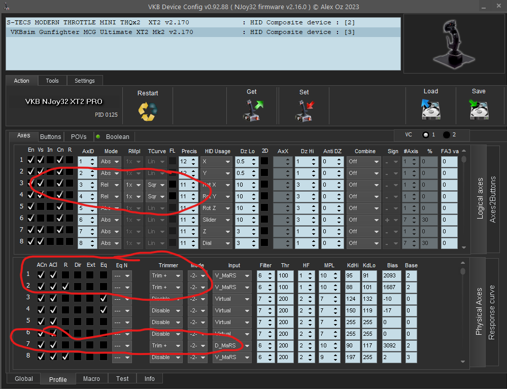 SBGGDoggyC Posted November 13, 2023 Posted November 13, 2023 6 hours ago, KpaxBos said: Hello, Thanks for the info. Can you give me your configuration (STECS Standard,and GF) for IL2 ? This to get an idea for mapping my config. Best regards. Absolutely. I'll attach the profiles zipped here along with some screen shots for explanation. Starting with the GF: For MCG Ultimate: 1) I use the a ministick in the Master Mode position and a standard 4-way POV in the GATE CONT position. For the Ministick I set the default mode to POV mode which i use to send 4 buttons plus the pushbutton (short-press sends logical button 34 (same as physical button)). In IL2 I assign these buttons to my trim "axes" as well as trim "switches", with the center push assigned to "reset trimmers". When I long-press the push button it changes to axes mode...where I have both axes set to relative axes (Axis ID 3 and 4) and then assign these to gunsight target size and gunsight target range in IL2. I use a Boolean to make the pushbutton push a second physical button (42 in my case) and then assign 42 to a RESET AXES function for Axis 3 and 4...which means pressing the center ministick pushbutton will reset those 2 axes to center. I use a shift modifier in IL2 for "reset trimmers" so that if I'm trimmed out and short press the pushbutton to reset gunsight axes, it doesn't also reset my trim. More on the shift modifier later... 2) I also programmed a "helicopter style" trimmer and reset for pitch/roll/rudder using the two right-hand grey buttons on the GF...mainly to have an easy way to trim my WWI planes in Flying Circus, but you could actually use this for ANY plane and not even bother with the trim assignments in IL2 if you wanted to use those POV buttons for something else. This is done usinge Fix Axes function (FA0) and for the upper button and Trim Reset function for the lower button. Note that there's a bug in firmware 2.16.5 that prevents FixAxes from working with more than 2 axes...but the latest version on their "hidden" server fixes this. I don't have the link but could send you the firmware in a zip file if you want. On my MCG Axes 1,2 and 7 are pitch roll and yaw. I tweaked this so that when I am holding level flight with any/all pitch/roll/yaw...I press that top button and it will fix or hold each axis at that location allowing me to return everything to center quickly (within .6 seconds) and that's where each new trimmed "center" is now. To reset just press the bottom grey button. If you don't care for this then just assign both buttons back as "buttons". But for Flying Circus I find this invaluable. Also works great for helis in DCS or XP12... 3) I use my Trigger flipup "safety" assigned to reload guns in IL2. I also have a button assigned to my brake lever which pulled all the way back is for parking brake. 4)SHIFT modifier. IL2 does have buillt in modifier buttons but you have to use keyboard CTRL/ALT/SHT/WIN. So I normally use my GF pinky button as a modifier in DCS but in IL2 you have to enable keyboard emulation and then assign a button to key press ***** (scan code 124) and select Alt/Ctrl/Shft or Win. The problem is that this also sends a "power button" code along with the modifier key you check off and yep...IL2 only sees the "power_key" and not the modifier. There's a way around that though. With Windows PowerToys you can use the Keyboard Manager to reassign (disable) this "power key" by pressing the button you assigned...which will be detected in PowerToys as "undefined" and then you change it to "disabled" which strips off the power key output and just sends the LALT (in my example). Problem solved and now you can double your button assignments in IL2 - effectively eliminating the 64 button limit (on both GF AND STECS with a single button). When you assign your shift button in VKBCFG don't forget to press the SET button to activate the change before you go into PowerToys. For STECS Standard - I also have 2X THQ connected which gives a total of 11 axes on the throttle...so I had to create a virtual controller to use 3 of the axes and my profile reflects this. You probably need to redo your axes settings if you load my STECS profile. Otherwise it's pretty standard fare. I disabled my STECS ministick button and the 5-way rotary buttons then assigned every other physical button on the STECS and STEM (including 2 4-way HATs in place of the right throttle buttons) and still had 8 buttons left over to hit my 64 button limit for IL2. I used those remaining 8 for one of my THQs (8 buttons each). And remember, with the LALT Modifier in place now I can double the number of assignments...equivalent to having a 128-button limit! Sorry this is so long...I'll post lots of screens for reference and just let me know if you have any other questions with my config and I'll try to help best I can! VKB.zip 3