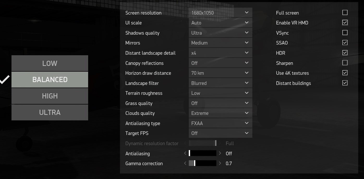 Voxman Posted January 7, 2024 Posted January 7, 2024 Just a quick update on this thread, if someone is searching, XRSnecksaver is working fine. Needed to add the openvr_api.dll file that's in that program, into the IL2 bin>game directory. As far as running the program with my rig, 3080ti, i7-10700K@5.1Ghz, and 16G memory, slightly overclocked, I'm able to play nicely in certain situations, but will need to improve my CPU/mem rig in the near future for smoother action when large multiple A/C are in the picture. I do want to make some improvements to my graphics settings, especially in game, if needed but really haven't a clue on a plan of attack at this point. My Varjo PPD setting is set to high, 35PPD. I really haven't tried any other settings here but it all seems good so far. My ingame settings are as follows: Should I turn off FXAA, and switch to MSAA? Not sure again. Game play is more important to me, as far as smoothness, but it's always nice to have some of that eye candy up and running.