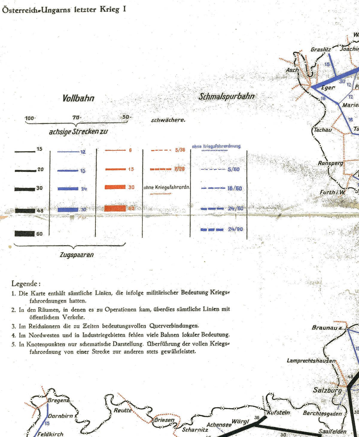 ZachariasX Posted January 1, 2024 Posted January 1, 2024 The maps indicate train connections. The connections are indicated according to their capacity. As I understand the diagram illustrating the line thickness, the color indicates how long freight trains are (numbers of axles) and how many train compositions commute on said connection (number of train compositions/Zugpaare). E.g. the thickest black line (lower left in the legend) indicates a connection that is served by 60 train compositions that are 100 axles long. As the weight per axle is limited and specified, this makes for the total weight of goods that are transported along that route per day. The left three colums indicate standard gauge, while the column on the right indicates a narrow gauge (in consequence less weight per axle, less capacity per train composition). Again thickness indicates the amount of compositions. Solid lines: Black 100 axles, blue 70 axles, red 50 axles. From what I see, the fraction indicated next to the (dashed) line with indicates the quota of military vs. civilian transports. Beautiful old-school German clerk-speak… 1) The map contains all lines that as a consequence of military significance have a wartime schedule. 2) In areas where there were [military] operations, furthermore all public transport lines [are added]. 3) Inside the Empire, the at times significant cross interconnections. 4) In the northwest and in industrial areas, many lines of local importance are omitted. 5) At node points only scematic representation. Transfer of the full military transport regime from one line to the other is always assured. Not having seen the full map, this is what I can gather. Hope it helps. 1