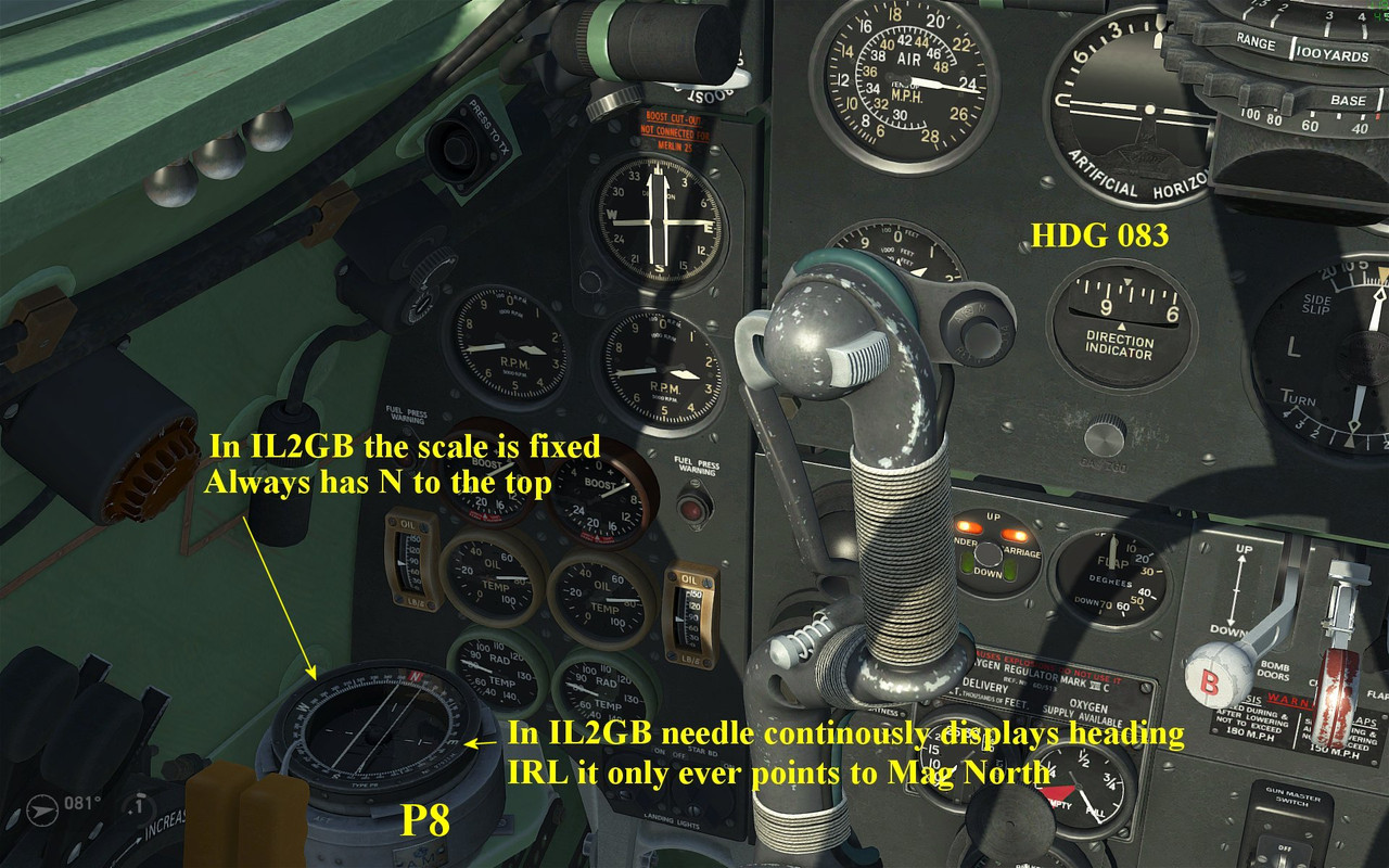 Bert_Foster Posted February 23, 2024 Posted February 23, 2024 The P8 needle in IL2 GB provides a continuous heading reference when read off the scale. In IL2GB the scale is fixed with N to the top of the instrument. IRL the Needle only points to Mag North. To get heading you then need to rotate the scale so the N is lined up with the needle you then read the heading by reference to the scale indicated by a marker (missing on the IL2GB P8) at the instruments 12 O'clock position. (Its modeled correctly in COD and DCS) Also it is my understanding that Magnetic variation is not modeled in IL2GB ?