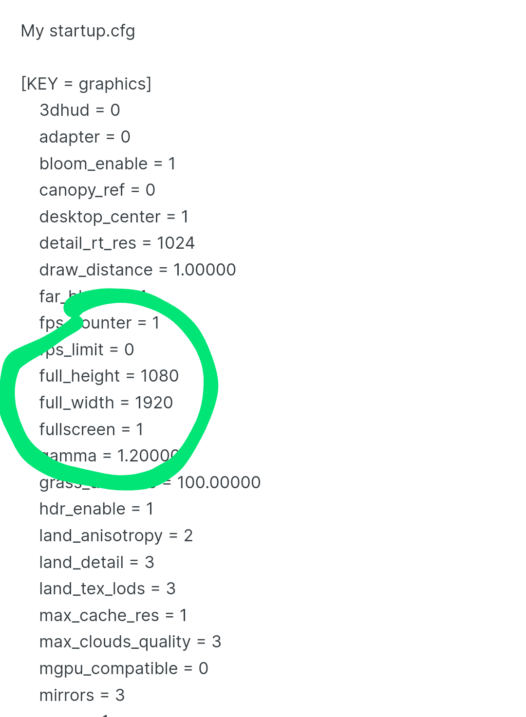 jippy13 Posted February 28, 2024 Posted February 28, 2024 (edited) I'd like to improve the graphic settings of the game in order to better detect my opponent in the sky. My real difficulty in the game is to spot my ennemy before him. So in this post, I would like to get the best parameters to spot my foes on my screen. Which are the best parameters in the game, on my nvidia card and on my samsung screen ? Thank you for your attention. My hardware : intel i7 11700, rtx 3070, monitor curved samsung Odyssey G5 27" G55T (lc27g55tqubuxen) My startup.cfg [KEY = graphics] 3dhud = 0 adapter = 0 bloom_enable = 1 canopy_ref = 0 desktop_center = 1 detail_rt_res = 1024 draw_distance = 1.00000 far_blocks = 1 fps_counter = 1 fps_limit = 0 full_height = 1080 full_width = 1920 fullscreen = 1 gamma = 1.20000 grass_distance = 100.00000 hdr_enable = 1 land_anisotropy = 2 land_detail = 3 land_tex_lods = 3 max_cache_res = 1 max_clouds_quality = 3 mgpu_compatible = 0 mirrors = 3 msaa = 1 multisampling = 2 or_ca = 0.00000 or_dummy = 0 or_enable = 0 or_height = 2644 or_hud_rad = 1.50000 or_hud_size = 0.75000 or_ipd = 0.06400 or_render_eye = 0 or_sipdc = 0.00000 or_width = 2644 post_sharpen = 0 preset = 3 prop_blur_max_rpm_for_vr = 155 rescale_target = 1.00000 shadows_quality = 3 ssao_enable = 0 stereo_dof = 5.00000 vsync = 0 win_height = 1440 win_width = 2560 [END] Edited February 28, 2024 by jippy13 1