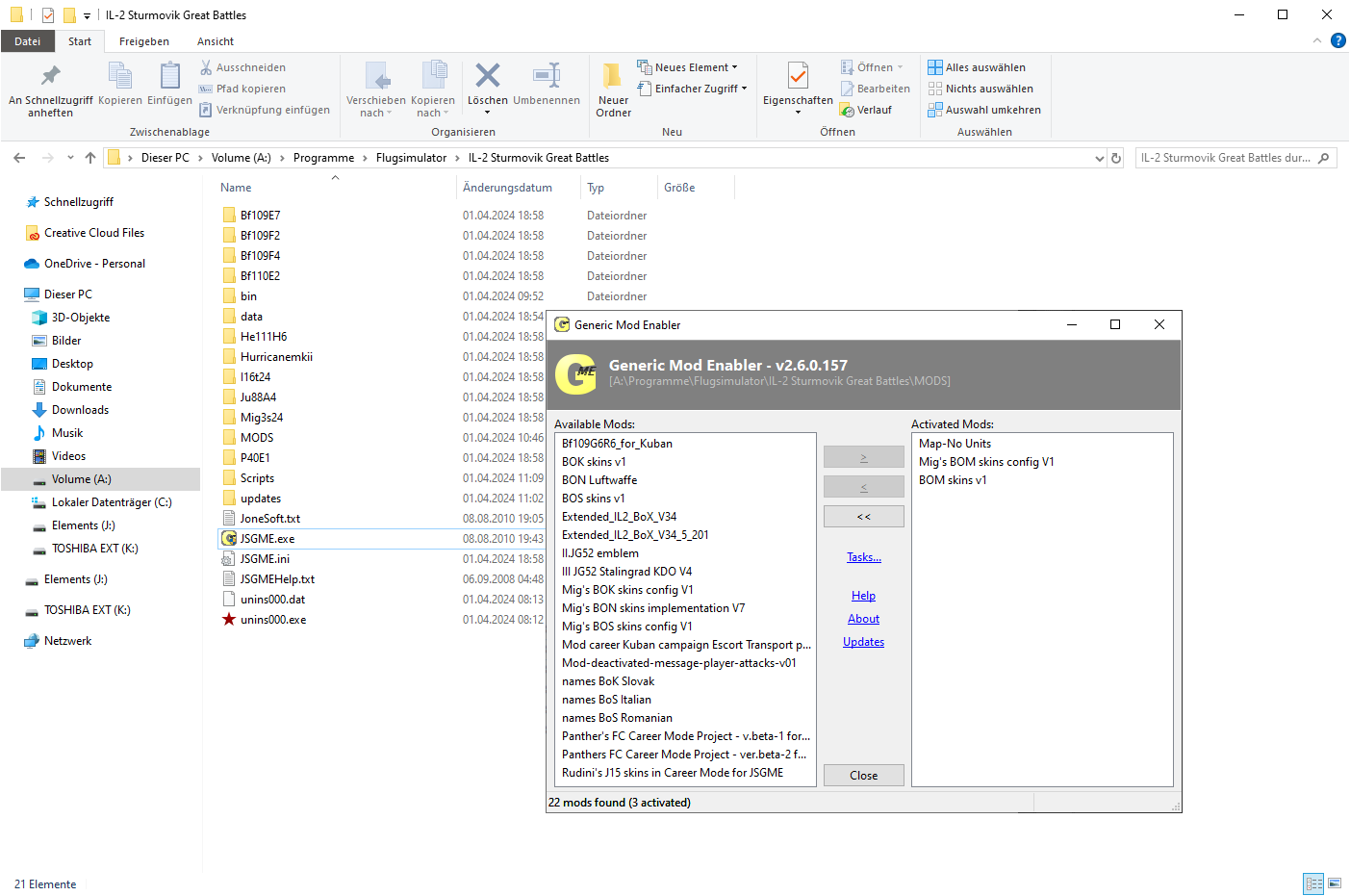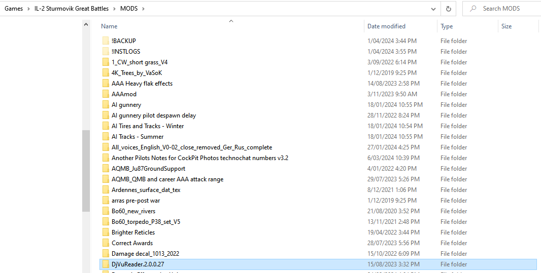 czech693 Posted April 1, 2024 Posted April 1, 2024 It appears that JSGME was working if you got a mod to install. I think the problem is how the mods are installed in MODS. You've got individual aircraft folders in your main game folder. They shouldn't be there. When you download a mod you have to check that it has the correct folder tree set-up. If it doesn't then you have to creat the folder set-up. Example for installing skins: IL-2 Sturmlovik Great Battles/data/graphics/skins/bf109e7. Some downloads are already set-up for JSGME, but some are not. I use 7-Zip to unpack the downloads. I select the download and it opens and I can see what's inside. If there is a data folder visible then it's already set-up for JSGME. If it's a .dds, .txt or some other item and not a folder then it isn't set-up yet.