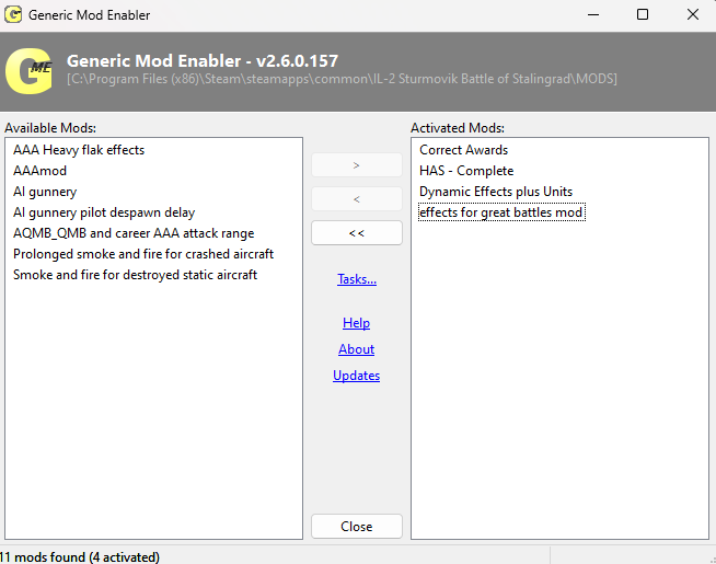 Ghost666 Posted April 25, 2024 Posted April 25, 2024 IIRC "effects for great battles mod" is the same as "Dynamic Effects plus Units" just with out the units. So you only need one. Here the order I use. 1) Dynamic Effects plus Units/effects for great battles mod 2) Prolonged smoke and fire for crashed aircraft 3) Smoke and fire for destroyed static aircraft 4) AAAmod 5) AAA Heavy flack effects 6) AQMB_QMB and career AAAattack range 7) AI gunnery 😎 AI gunnery pilot despawn delay 9) Correct Awards 10) HAS - Complete Yes, some of the Mods will turn gray. Don't worry, that just means they are working in the same folder/file.