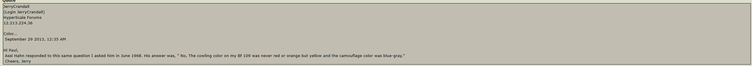 sevenless Posted June 26, 2024 Posted June 26, 2024 (edited) 52 minutes ago, DFLion said: I have two old publications by Geoffrey Pentland and Anthony Shennan which describes the Fw190 in great technical detail. In part 2 of these publications I have at least 3 color plates showing red cowls, including the pic above. Yep I know, that is most likely the "problem", the Pentland piece is from 1968. Back then in the 70s/80s there were many photo misinterpretations of gray scales on german planes made. One of the most "prominent" ones might be the 109 F2 of Hans "Assi" Hahn by some toy companies and model makers. Bf 109F-4 Hans 'Assi" Hans Jg 2 (hitechcreations.com) Just want to make sure you are aware of that. As I said, if its a deliberate design decision by you I can live with that. Anyways, if you google for Siegfried Schnell, Josef Wurmheller, Egon Mayer, Kurt Buehlingen, Erich Ruhdorffer you can find plenty of depictions of their planes. All with yellow cowling and yellow rudder. Try to go for profiles by Claes Sundin. The most reliable you can get. Luftwaffe Fighter aircraft (luftwaffeinprofile.se) Quote I know Clostermann was prone to exaggerate, though I feel in these early chapters of his book he was graphically describing what he saw - I'll stick with this for the mission. I dont want to comment on Clostermans colourful description of events. Others have done that already. I put it under "authors license". Anyways his book is a pleasure to read with a grain of salt. I would say its a docu-novel. Very entertaining. Edited June 26, 2024 by sevenless