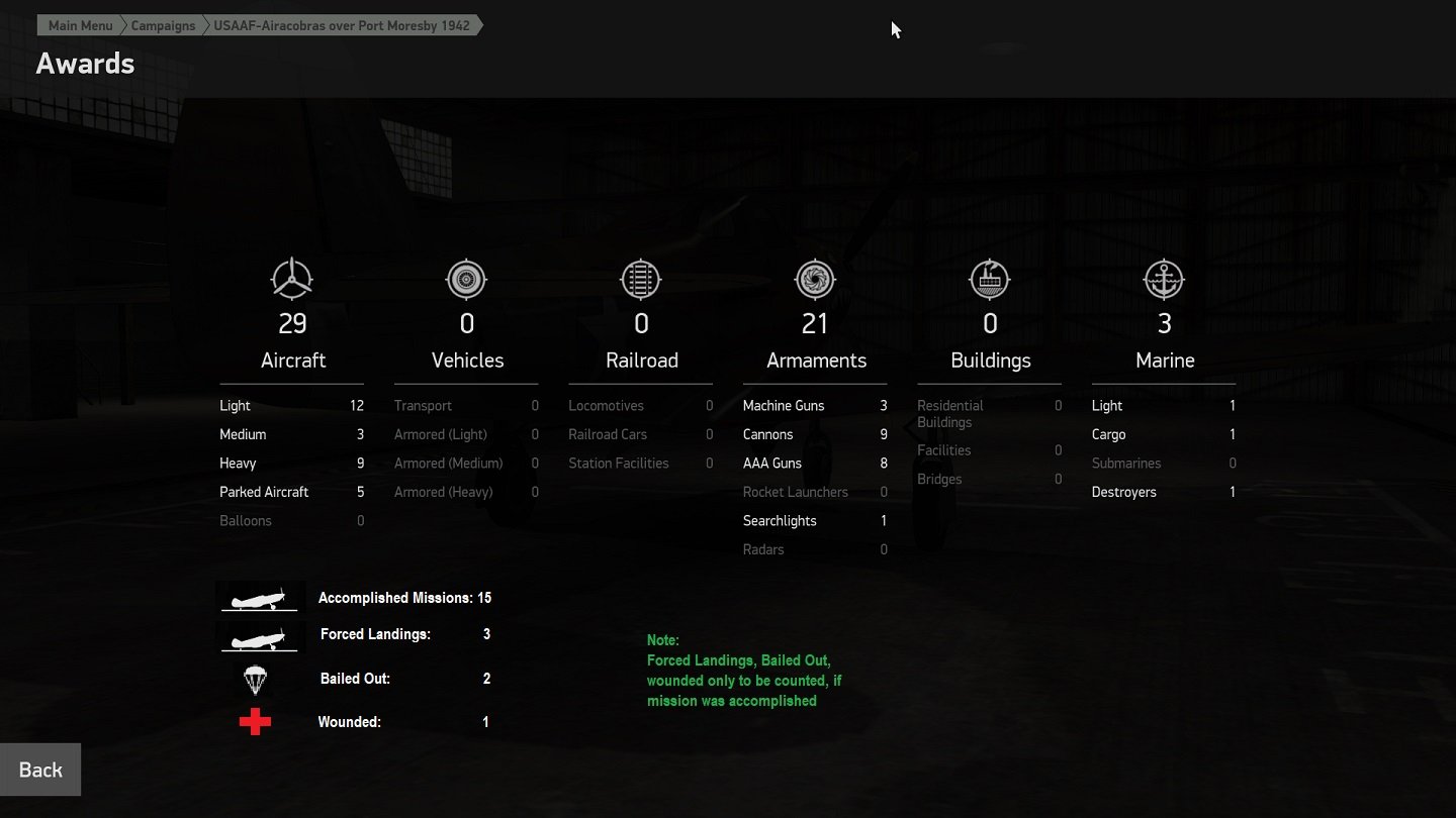kraut1 Posted June 30, 2024 Posted June 30, 2024 Hello Developers, I know that you are always busy with very many urgent tasks, but here a suggestion that is maybe easy to be implemented. To avoid misunderstandings: My intention is not to change the campaign "mechanics" itself. I suggest only to add some statistical data to the "Awards" screen: -As mentioned in the note Forced Landings, Bailed Out, Wounded only counted, if the mission was accomplished. 1