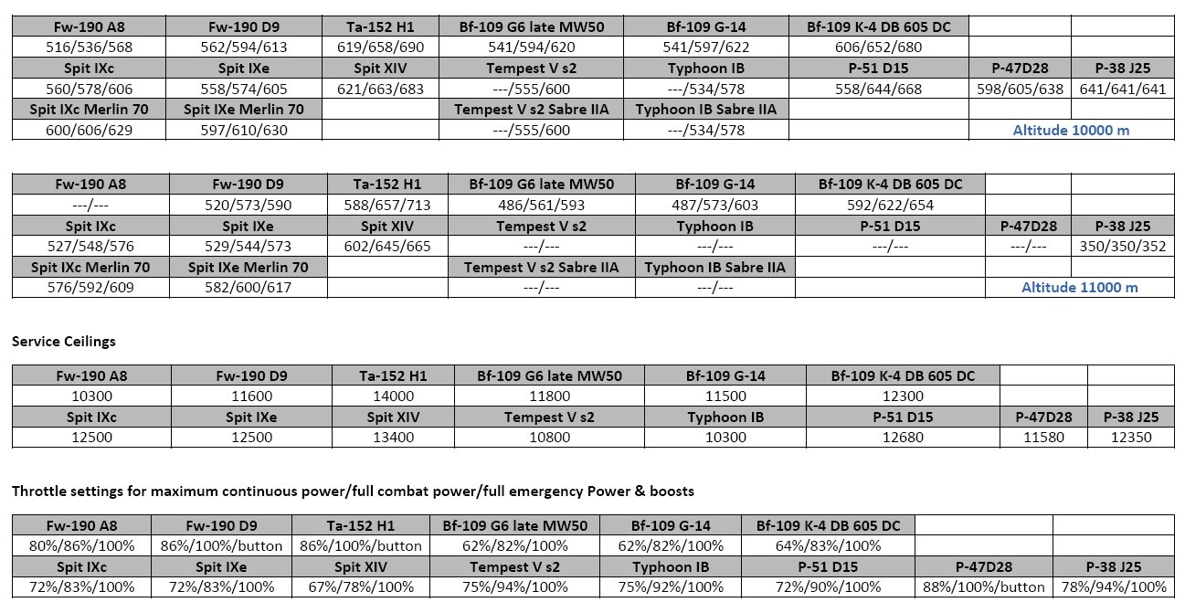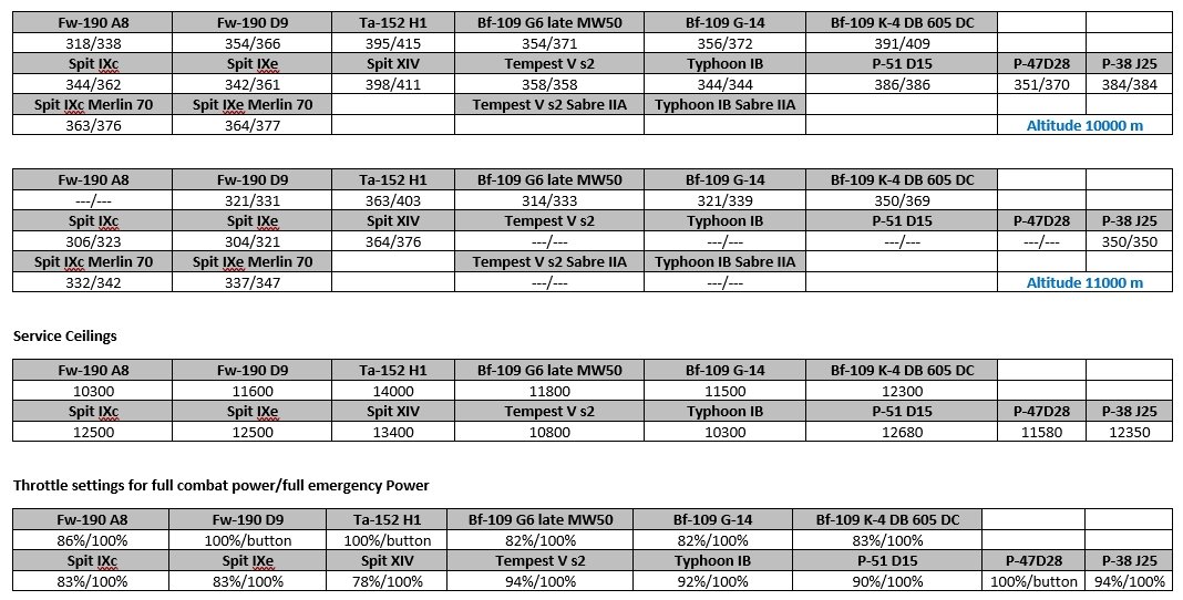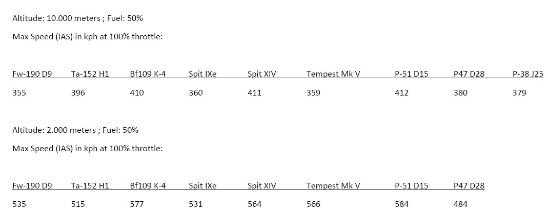 eastriverman Posted August 15, 2024 Author Posted August 15, 2024 4 hours ago, HazMatt said: I see. Thanks for clarifying. I thought you were talking about the online servers for some reason and not the single player. I was saying that most of the maneuvers I use vs other players seem to work ok in the TA-152, however to me it seems a little slow on climb rate and acceleration but that could all be in my head as I have no charts or numbers to prove that. Wow! That Typhoon is faaaaast at 500M. Well, several other planes are faster, the Tempest for example .... By the way: combat power and emergency power can only be maintained for a short time and especially for Tempest and Typhoon the emergency power lasts only for a VERY short time. Therefore, I'll soon submit an extended chart that also contains the speeds for maximum continuous power (Dauerleistung). Your remark about acceleration is interesting. I noticed that, too. The difference in acceleration between some of the fighters is significant. You are also right with the climb rate of the TA-152. On the german side the Bf-109 K-4 has one of the best climb rate of all fighters. The only thing we have to find out is if the increased that comes with the larger wing area of the Ta can be used in an advantageous way. best regards eastriverman 3 minutes ago, eastriverman said: Well, several other planes are faster, the Tempest for example .... By the way: combat power and emergency power can only be maintained for a short time and especially for Tempest and Typhoon the emergency power lasts only for a VERY short time. Therefore, I'll soon submit an extended chart that also contains the speeds for maximum continuous power (Dauerleistung). Your remark about acceleration is interesting. I noticed that, too. The difference in acceleration between some of the fighters is significant. You are also right with the climb rate of the TA-152. On the german side the Bf-109 K-4 has one of the best climb rate of all fighters. The only thing we have to find out is if the increased that comes with the larger wing area of the Ta can be used in an advantageous way. best regards eastriverman aaah forgot "lift" 😉