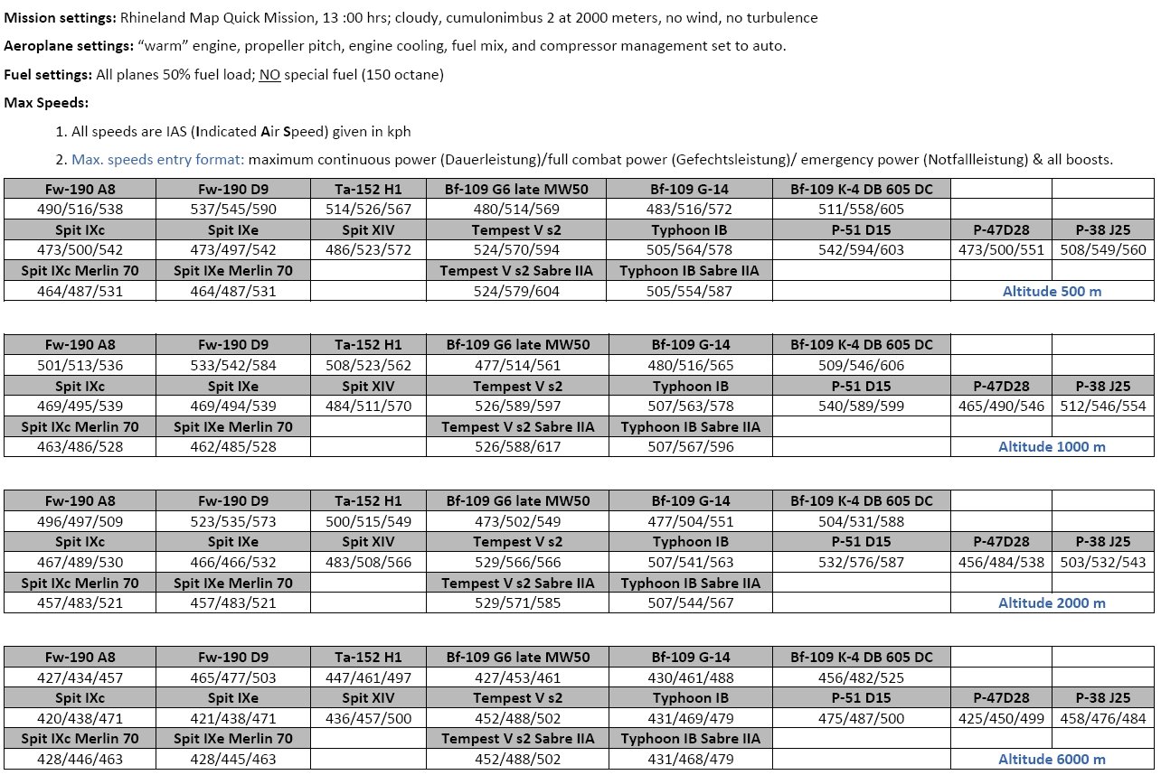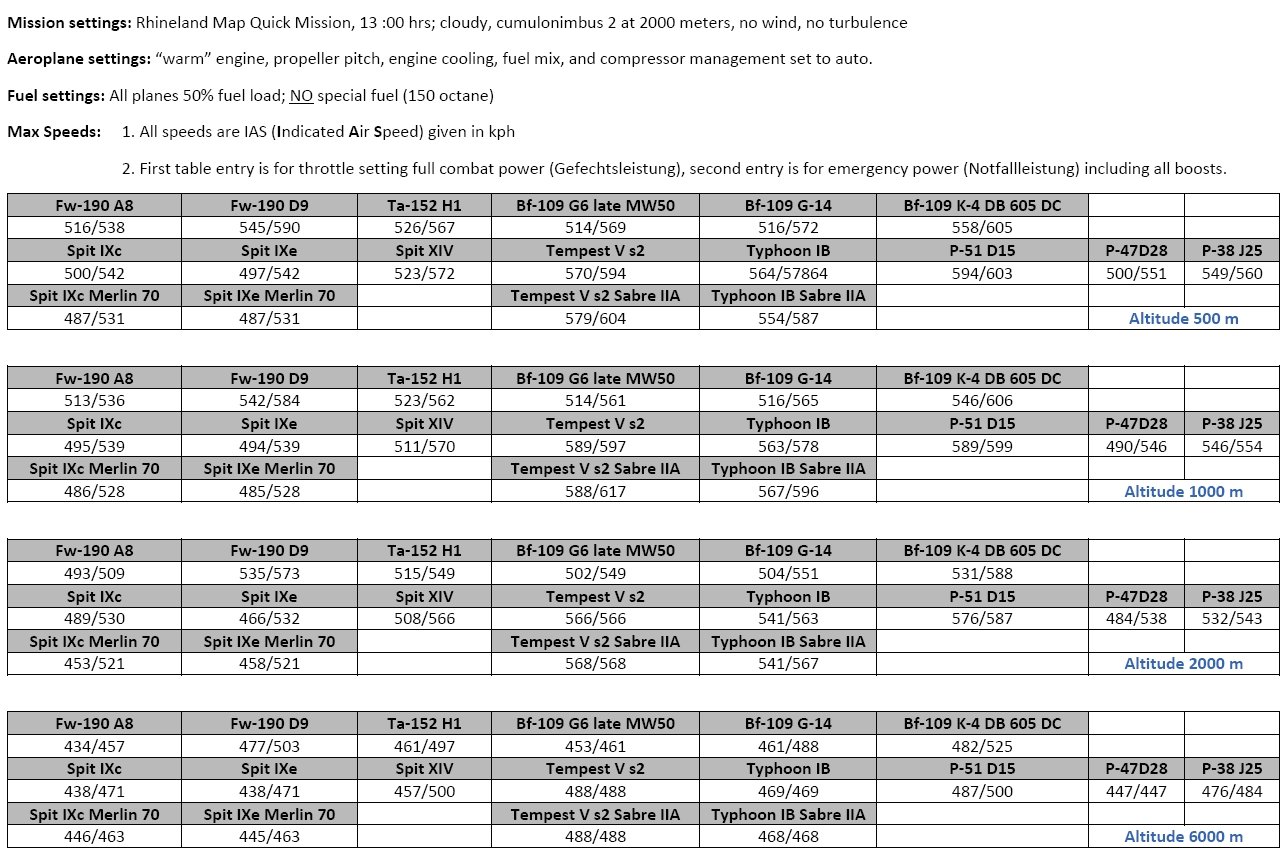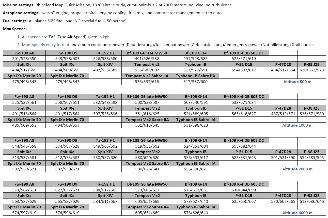 sevenless Posted August 24, 2024 Posted August 24, 2024 On 8/21/2024 at 12:50 PM, eastriverman said: It's true that the use of flaps in comat is limited except you want to have an edge in close range dogfight. Most people including me evolve their personal tactic and then stick to that. In my case I prefer zoom and boom tactics because my favourite rides (Bf-109 & Fw 190) can do this pretty well and you have better control over the battles compared to a wild furball dogfight where the situational awareness soon get's lost. Apart from that using flaps adds another thing you have to mange beneath motor management, maneouvering, and shooting. Aah, I promised another version of the speed chart (see below) and I found another quirk here. At 10.000 meter neither the Tempest nor the Typhoon can be flown with continuous power (Dauerleistung). If one tries the speed slowly decreases until stall speed is reached and one literally falls out of the sky. Another strange thing...... 👍 Minor addendum. The Fw-190 A8 has a boost setting triggered by button. IAS 546 kph @ 500metres on Rhineland spring map. So it is slightly faster than the Spitfire IXs at this altitude.