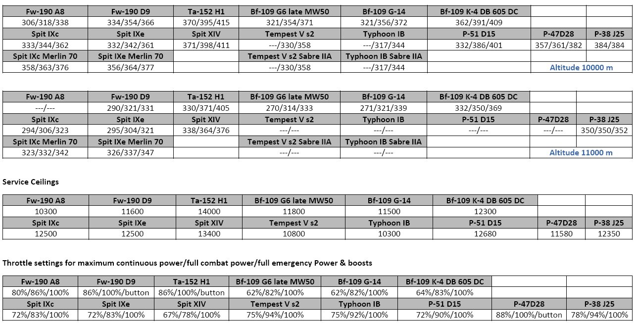 eastriverman Posted August 21, 2024 Author Posted August 21, 2024 18 hours ago, HazMatt said: I haven't been able to figure out how to do the simulator battles yet but I managed to figure out how to play the arcade battles and if I recall correctly I ranked something like 10 in my first one and second or third in my second one. I only played arcade a couple times as I found it way to gamey for me. It's actually way more complex then I thought with multiple types of game currency and research points and stuff you can add to each plane. What I'd like to do is compare a plane there to the modeling of a plane here but I don't think they even have the TA-152. Maybe I can figure out how to do it with one of the 109 models for fun. Maybe somebody has already done it. I'm gonna go poke around the internet and see what I can find. It's true that the use of flaps in comat is limited except you want to have an edge in close range dogfight. Most people including me evolve their personal tactic and then stick to that. In my case I prefer zoom and boom tactics because my favourite rides (Bf-109 & Fw 190) can do this pretty well and you have better control over the battles compared to a wild furball dogfight where the situational awareness soon get's lost. Apart from that using flaps adds another thing you have to mange beneath motor management, maneouvering, and shooting. Aah, I promised another version of the speed chart (see below) and I found another quirk here. At 10.000 meter neither the Tempest nor the Typhoon can be flown with continuous power (Dauerleistung). If one tries the speed slowly decreases until stall speed is reached and one literally falls out of the sky. Another strange thing......