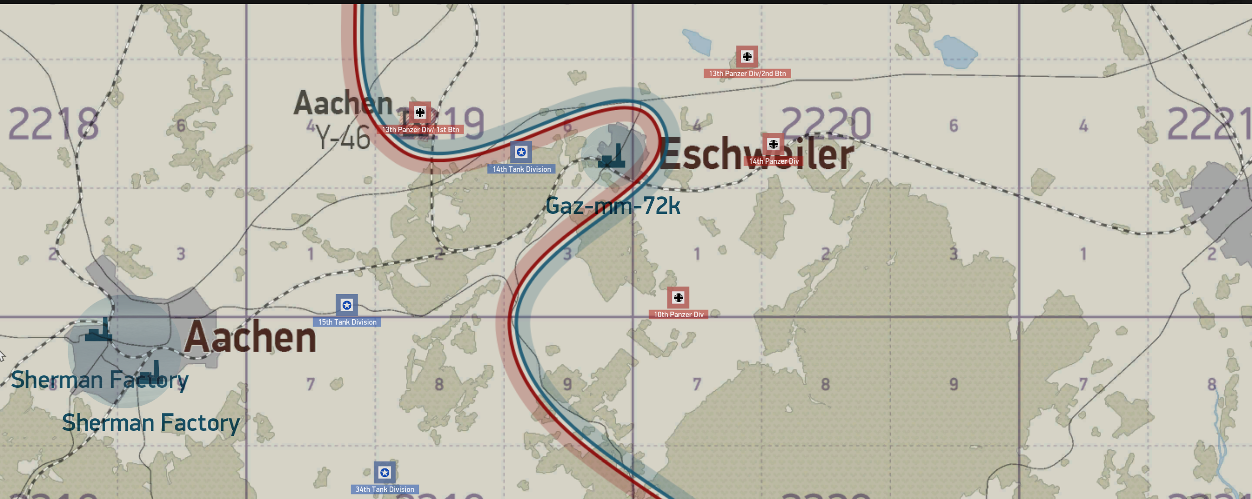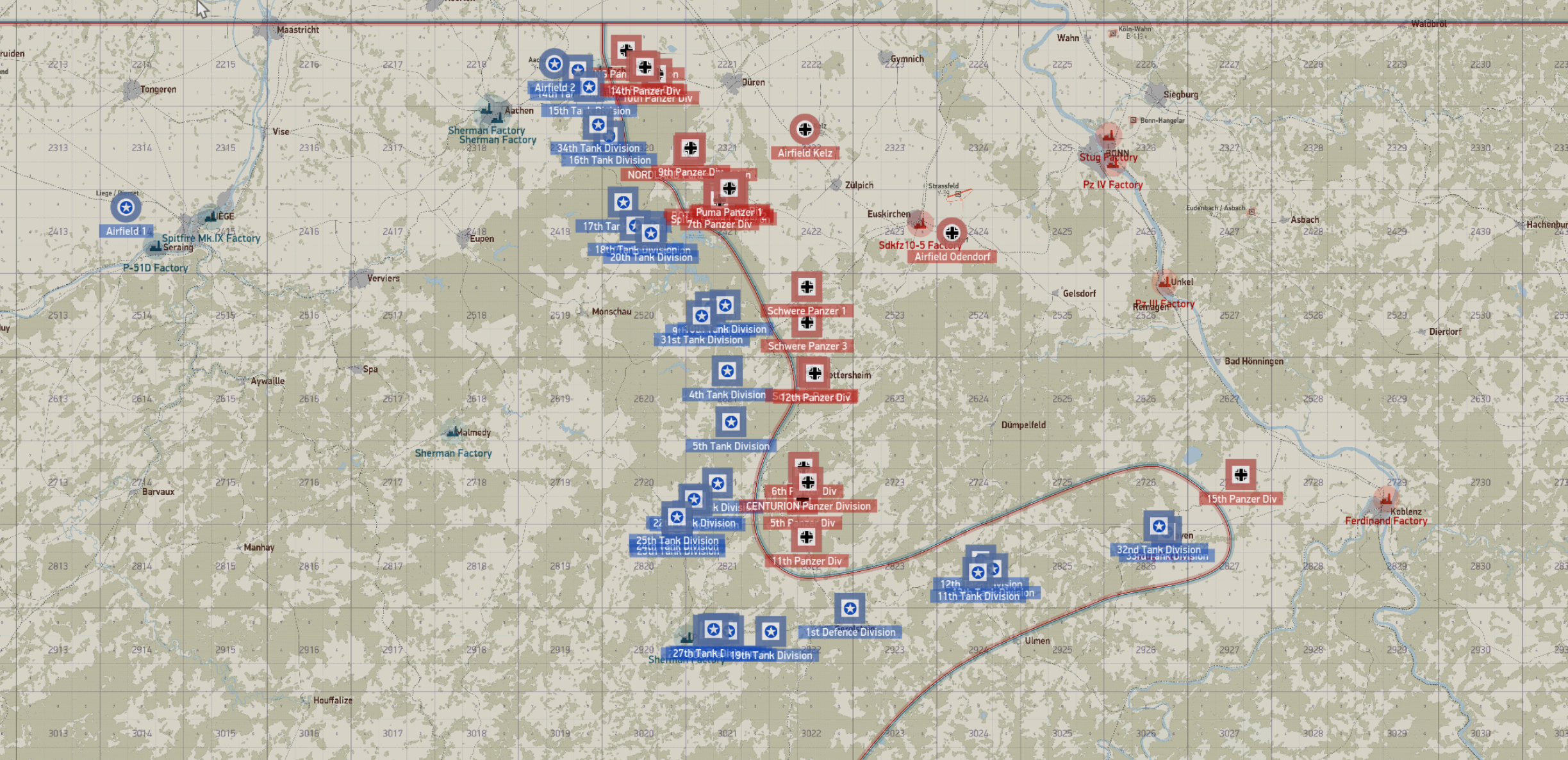 SCG_HITMAN_413 Posted October 13, 2024 Author Posted October 13, 2024 (edited) AXIS forces have managed to deliver a serious blow to the Allied forces around Eschweiler. 1st and 2nd battalion of the 14th Tank division were destroyed and the airfield west of Eschweiler was also captured, containing about a third of the current Allied plane reserve. 74 planes were lost in there. In the south 34th and 16th tank divisions were pushed away from their positions. The only force that managed to keep its position was 3rd battalion of 14th Tank division. They are now the sole defenders of the city of Eschweiler. Despite all that, the Allied forces have also managed to deal some heavy loses to the AXIS forces. That victory came at the cost of around 35 heavy tanks - Panthers and Tigers, and number of medium Pz IVs lost defending the division camps. VIKING Panzer Division was overrun but later the position was recaptured by the German forces. So despite the immediate danger looming over the city of Eschweiler, the german positions are now significantly weakened, exposing them to Allied counter attack. The remaining german forces are resupplying and preparing for a final push on Eschweiler and complete destruction of the Allied forces around the city. Edited October 13, 2024 by SCG_HITMAN_413