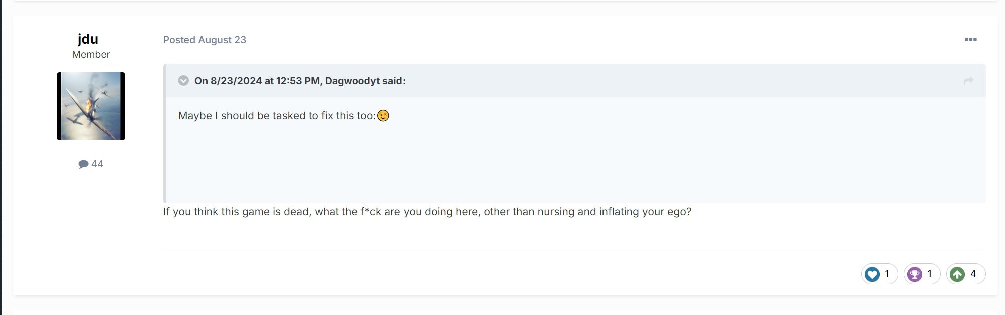 Cloyd Posted September 18, 2024 Posted September 18, 2024 As a CloD fanboi since before day one and as an offline player, I've come to accept that CloD is... ...irrelevant. 3 1 1