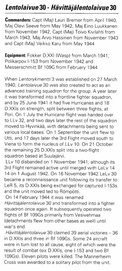 Missionbug Posted March 11 Posted March 11 (edited) 1 hour ago, BlackSix said: By the way, I can't find any information yet about when HLeLv30 got the Bf 109 Gs and where they were based after that. If we can use this squadron in 1944, we'll probably get Hurricanes in 1941. Except this from the "Osprey - Aircraft of the Aces 023 - Finnish Aces of World War II" According to "Finnish Air Force 1939-1945 by Kalevi Keskinen & Kari Stenman" , "During March of 1943 a new fighter squadron, LeLv34, was added to LeR 3 equipped with 30 new Messerschmitt Bf109G-2 fighters". Nothing yet on where they were based although I think LeR 3 was in the Karelian Istmus. In the same book the order of Battle for 9th June 1941 shows HLeLv34 as based at Kymi. I will do a little more of a search in my book shelf and see what else there might be, the Finnish community will I am sure have better more up to date information that might supersede the above. Take care and be safe. Wishing you all the very best, Pete. Edited March 11 by Missionbug 1