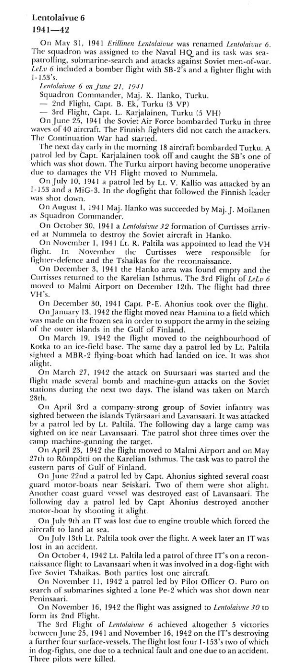 1CGS BlackSix Posted March 11 1CGS Posted March 11 3 hours ago, Hanu said: Kymi airfield was hastily built, construction started in 1942 and was completed in April 1943 (at least first plane landed there then), so its a bit problematic. AFAIK the most accurate base in Karelia map would be Römpötti during LeLv30 time before they were equipped with Bf-109's during '44. Hurricanes had quite little actual usage, that's true. They were suffering missing spare parts. I guess you have to stretch the facts a bit to get the campaign working, I'm afraid. Sadly those 2/LeLv 6 VP's (Bombers) were SB-2's (which I would reeeeeaally love to see in this game btw) I think that using Kymi in 1941 is the least of our problems)) Thanks for the additional information! Even more SB is missing for the Soviet regiments, of which there were many in 1941. By the way, I can't find any information yet about when HLeLv30 got the Bf 109 Gs and where they were based after that. If we can use this squadron in 1944, we'll probably get Hurricanes in 1941. Except this from the "Osprey - Aircraft of the Aces 023 - Finnish Aces of World War II" 2 hours ago, Avimimus said: Here is my logic: 1) A lot of Finnish aircraft were used in small numbers and sporadically. This is characteristics of the Finnish air force during the war. 2) A lot of types of Finnish aircraft will be missing. In terms of historical accuracy, having an aircraft be missing is almost as bad as having an aircraft be present that shouldn't be there. The difference between the Hurricane Mk.I and Hurricane Mk.II isn't that great. 3) Overall it represents the historical situation better to have a very small chance of small flights of Hurricanes appear than to have none. The Hurricanes would help represent the fact that the Finnish airforce was very varied in the equipment they used. Furthermore, if the campaign engine can produce flights consisting of only two aircraft then it wouldn't have a big effect on gameplay other than to add much needed variety. 2 hours ago, Hanu said: I tend to agree with Aviminus here. Until Brewster and/or Fiat G.50 is in game, you'll have a hard time to have meaningful missions that have more than couple of Finnish planes in it. (until G-2's start to appear in spring 1943.) Thanks!