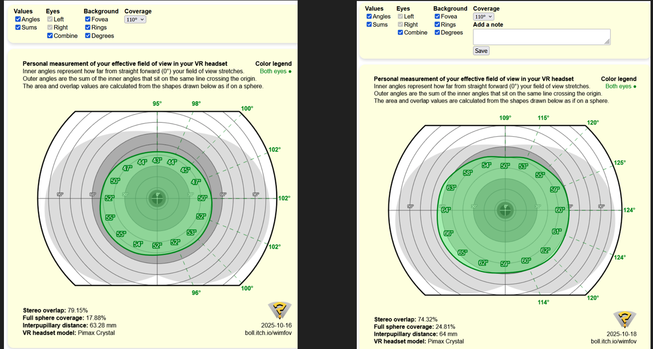 DBCOOPER011 Posted October 18 Posted October 18 (edited) So I took the plunge and bought a 50ppd Crystal Super from Walmart online. Price wasn't too bad at $799 upfront with $936 for the prime subscription fee. I should be able to deduct $399 from the prime fee since I already own the OG Crystal. The setup came with the DMAS speakers, Top Strap, and extra face cushion that I wasn't expecting. Everything is operational, but it has slight mura when looking at very light/white scenes, although not noticeable in games I've played so far. The screen at it's recommended render resolution of 6240x6280 is very sharp, but not manageable for me to maintain a 72Mhz frametime in Il2 with my 5090/9800X3D. Using Opencomposite and the OhneSpeed OpenXR Toolkit mod, I was able to get and maintain a 10-11ms frametime in Il2 by cutting the upper vertical resolution 30% and the bottom %10. I wasn't able to view this area anyways in the headset and the final resolution was 6240x4568. I tested my OG Crystal and Super in Wimfov and seen the horizontal/vertical increase below. This was measured with optical inserts installed. I think I'll probably keep this one.. Edited October 18 by DBCOOPER011 2