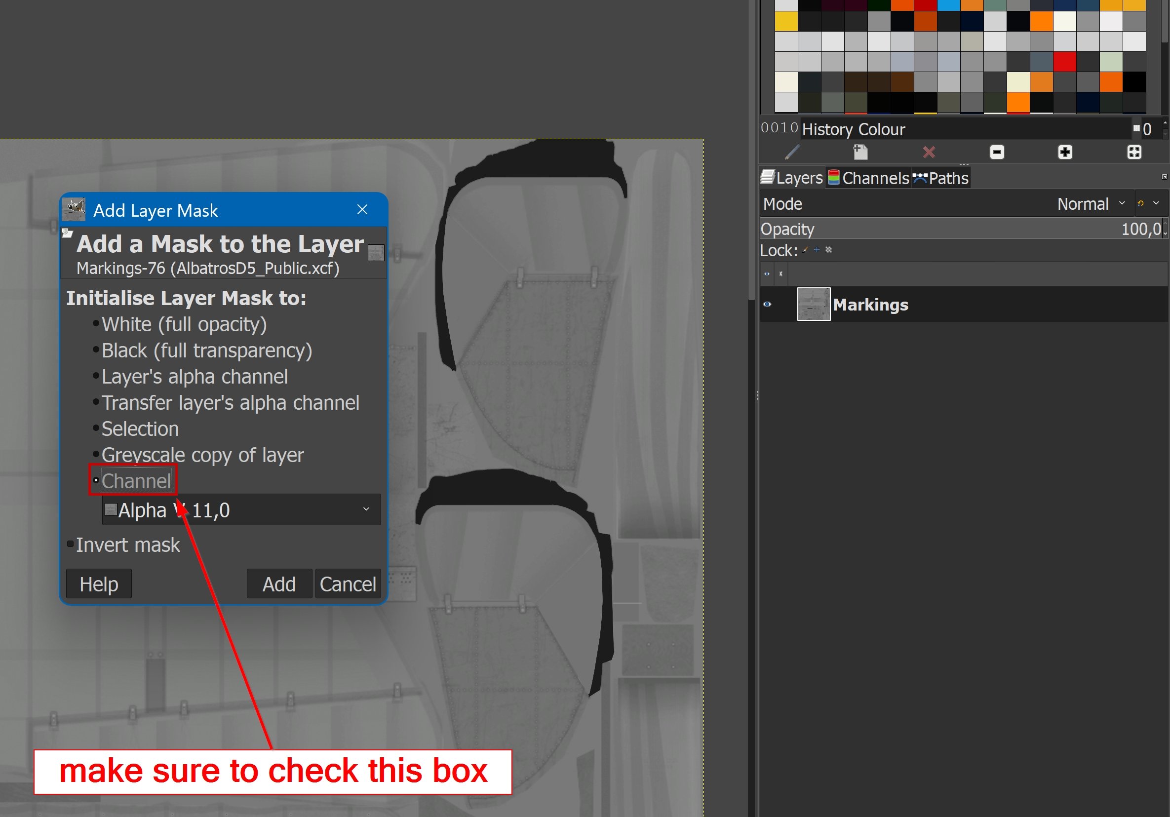 BrotKasting Posted October 8 Posted October 8 @JGr2/J5_W0LF- So, basically you have your Albert Ross DV skin file open in Gimp. Plus, you have a second file, the Alpha file, open as well. And you are wondering, how to get it into your skin file? Piece of cake! Select your Alpha file. I assume it is one layer already, if not, you have to flatten it. Select the alpha layer by left clicking it. Then copy it, using Ctrl+C. Now select your Albert Ross DV skin file. Left click the first layer and put your alpha layer on top of it, using Ctrl+V. You´ll see, that GIMP is trying to insert it but it can´t since the layer is floating. There is a second step required; you have to left click on the "create new layer"-button, lower right hand corner. Now your alpha layer will appear in all its glory. Copy it again then, using Ctrl+C again. Select the channels tab. Deselect the layers for Red, Green, Blue and Alpha by left clicking them. Then create a new layer by left clicking the "create new layer"-button. Insert your alpha layer by using Ctrl+V. It will not appear as a layer and it looks like nothing is happening since GIMP is trying to put it in, but it cant; the layer is floating. Select the layers tab again. Hit the "anchor the floating layer"-button. Select the channels tab again. There it is. Turn back to the layers tab. Flatten everything, add your alpha layer by using "add layer mask", then create your Albert Ross DV skin.dds by using the "export as" option as usual. Sounds complicated? It´s not, just a lot of steps. Practice makes perfect and all that stuff. There is also Eggnog´s short video, describing the whole process, see below. 1